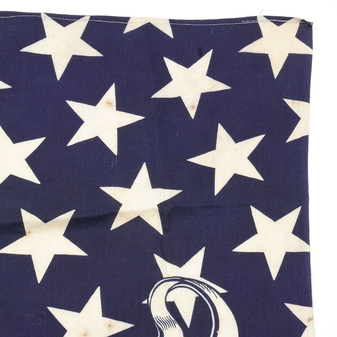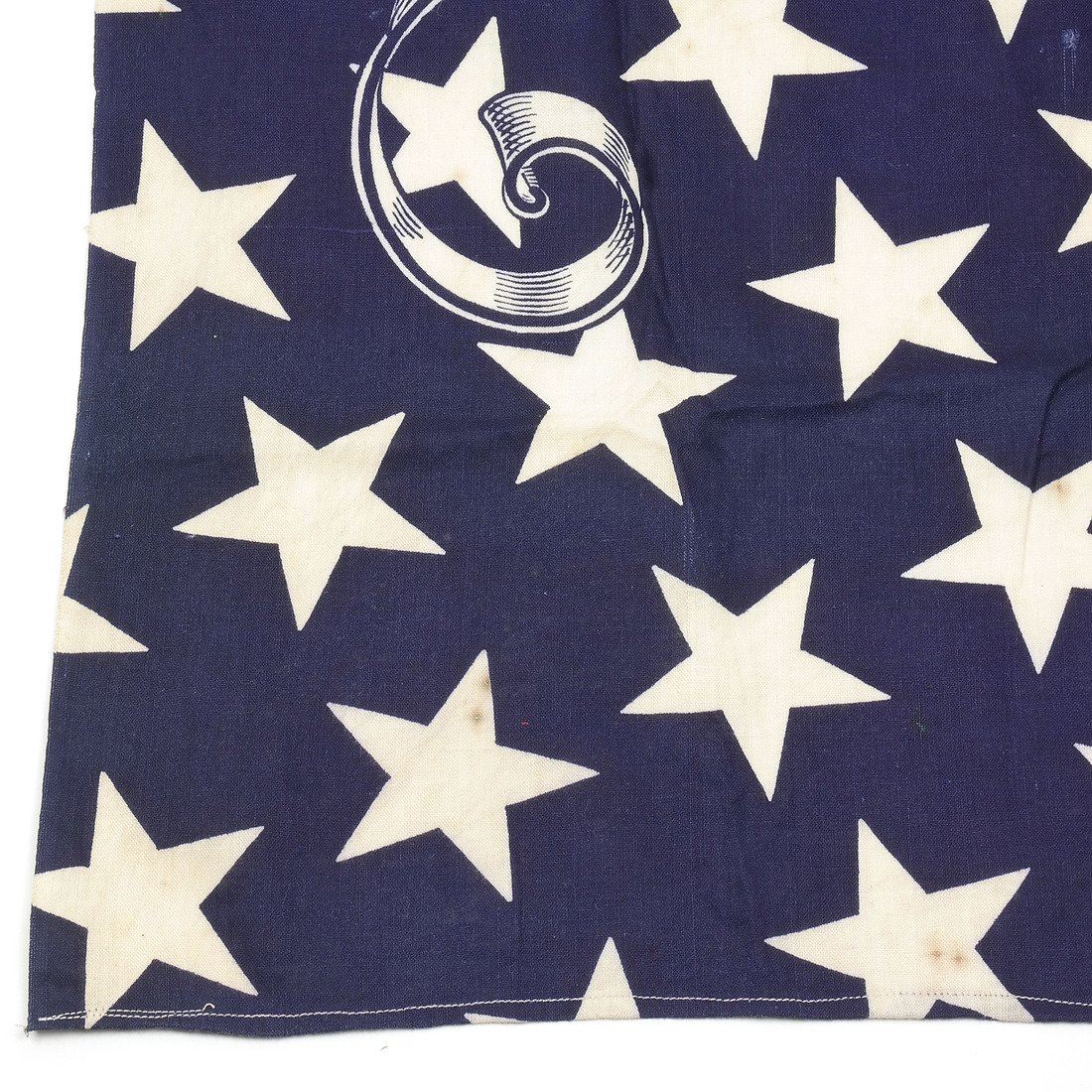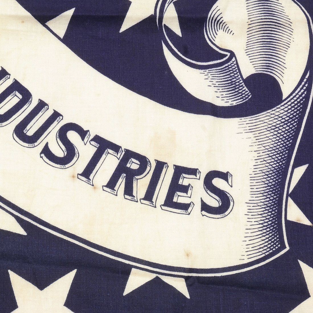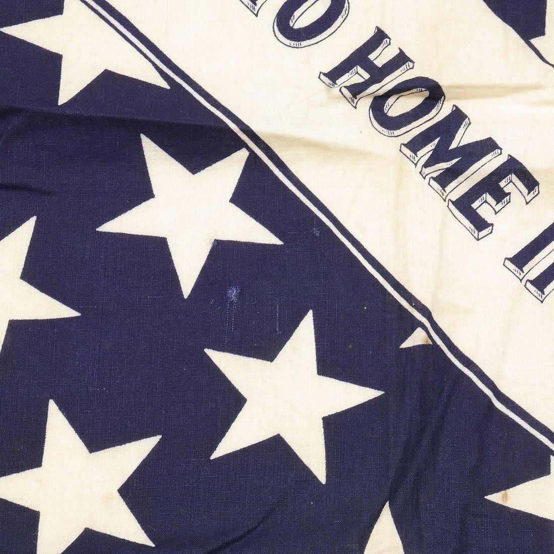 Deep blue cotton bandana or full-repeat of bunting announcing the platform of the 1888 Republican presidential candidate Benjamin Harrison. Decorated with repeating stars and banner with text "Protection to Home Industries".