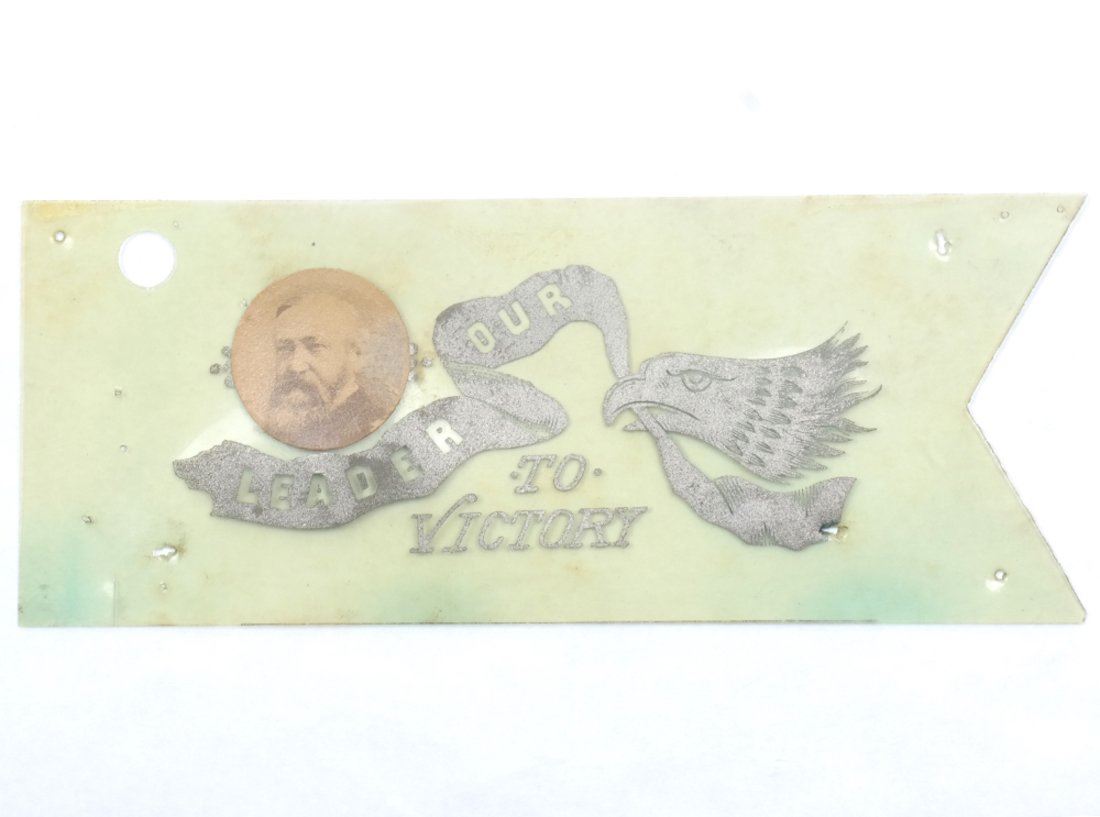 Comprises 1.) Silk red, white, blue, and black stevengraph ribbon. Features Harrison in a bust length, 3/4 profile, pose at top with federal eagle and U.S. flags immediately below. Bears White House vignette at bottom. Text relates "Benjamin Harrison / Republican Candidate / For President 1892." Retains pointed bottom with blue silk thread tassel. 2.) Yellow tint celluloid ribbon with applied circular albumen portrait of Harrison. Bears silver-tone imprint of an eagle and the text "Our Leader / To Victory." 3.) One page, 8vo, autograph letter signed "Whitelaw Reid," on New York Tribune stationery, New York, N.Y., March 2, 1880. Addressed to "Wm. J. Gable," Reid answers a biographical query concerning a Mr. Taylor of Boston. 4.) Two diminutive printed advertising cards. One bears map of the U.S. with imprint "Protection to American Industries." Verso, titled at top "Republican Souvenir Badge," contains a list of various presidents' popularity with soldiers.The second card bears jugate portraits and imprint "Compliments of W.D. Fox, Hatter & Furnisher...New London, Conn."