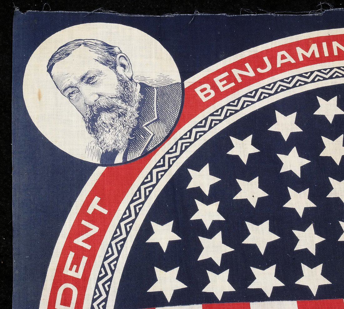 Printed cotton bandana supporting 1888 Republican presidential candidate Benjamin Harrison and running mate Levi P. Morton. Striking graphic banner with deep red and blue dyes. Bears four jugate portraits, two each of Harrison and Morton, around a circular stars-and-stripes shield (with 46 stars) within geometric border. Imprinted "For President / Benjamin Harrison / For Vice President / Levi P. Morton".