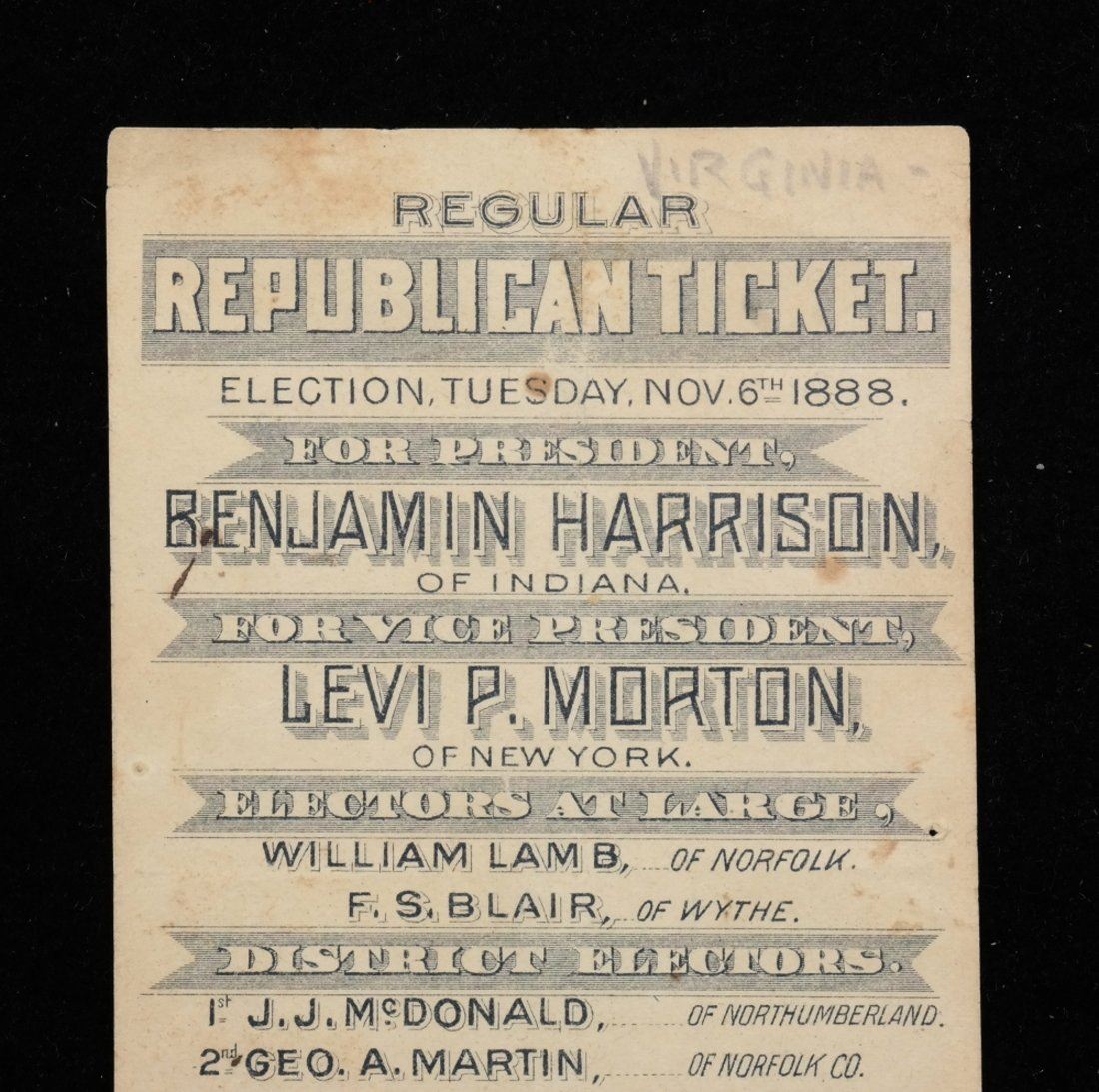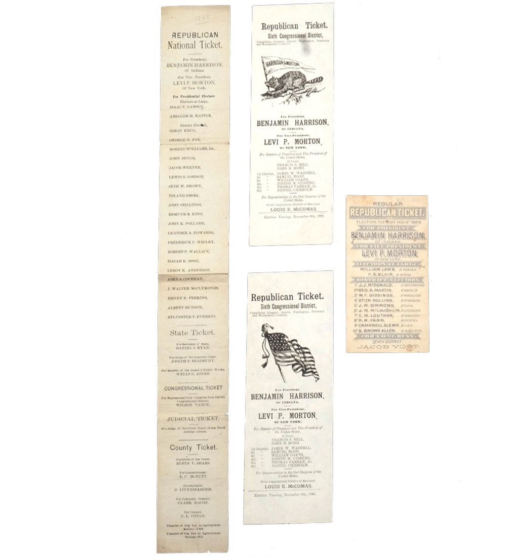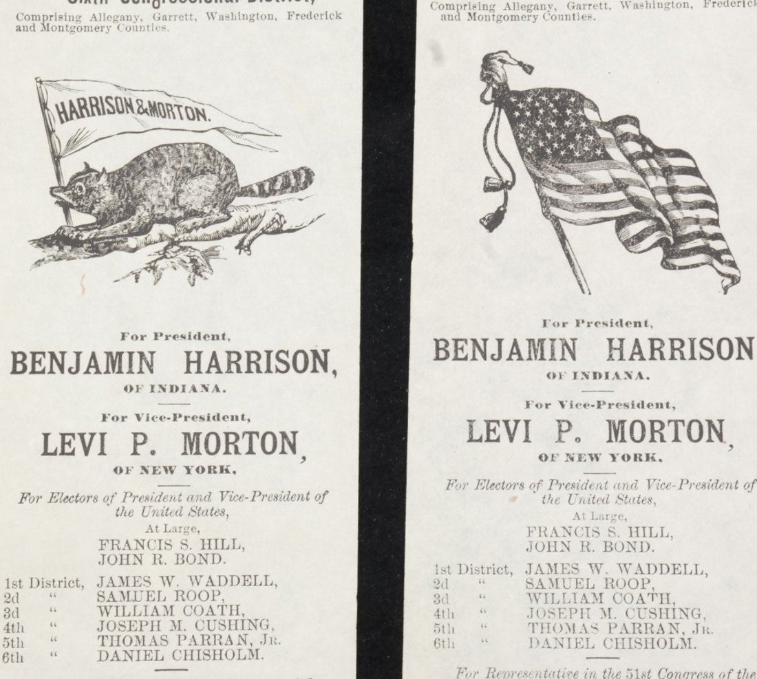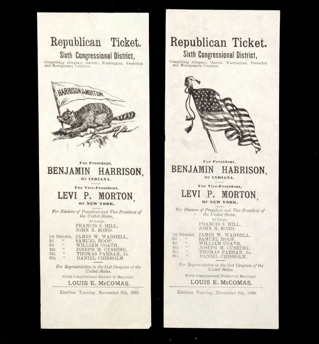 Comprises: 1.) Ohio "Republican National Ticket" with list of Presidential Electors below segregated into "Electors - at - Large" and "District Electors." 2.) Maryland pictorial "Republican Ticket. / Sixth Congressional District..." with list of Electors below. Features vignette depicting a waving U.S. flag with liberty cap topping pole. 3.) Maryland pictorial "Republican Ticket. / Sixth Congressional District..." with list of Electors below. Features vignette depicting a raccoon holding a pennant from its mouth with "Harrison & Morton" emblazoned across the front. 4.) Virginia "Regular Republican Ticket" with list of Electors at Large, District Electors, and a congressional candidate.