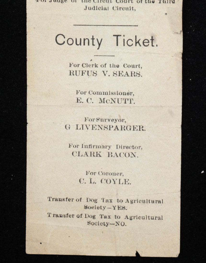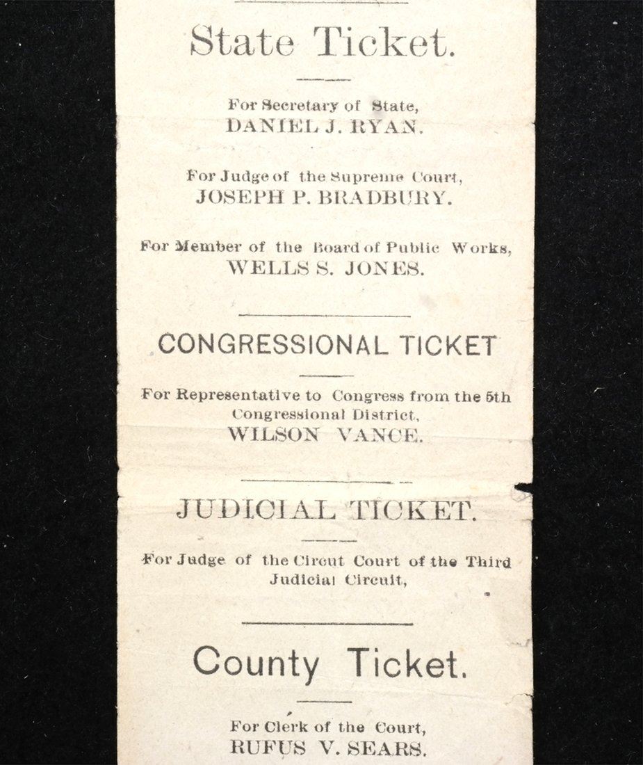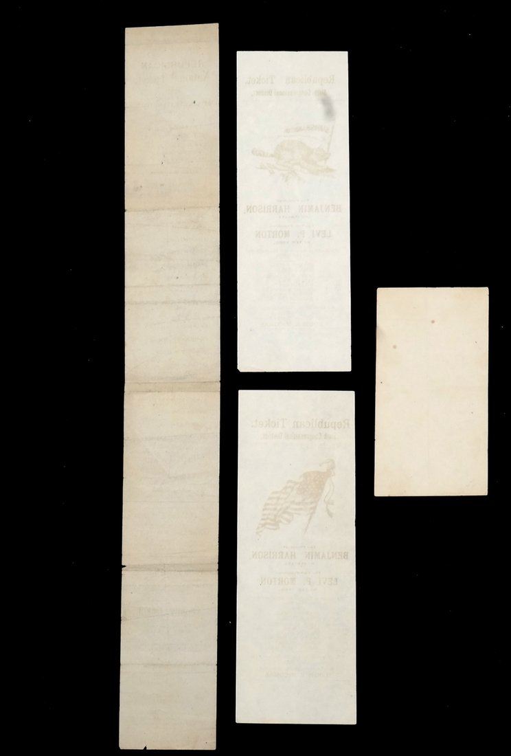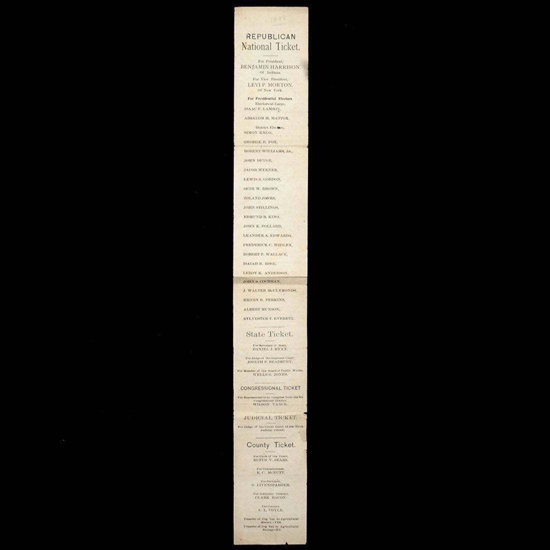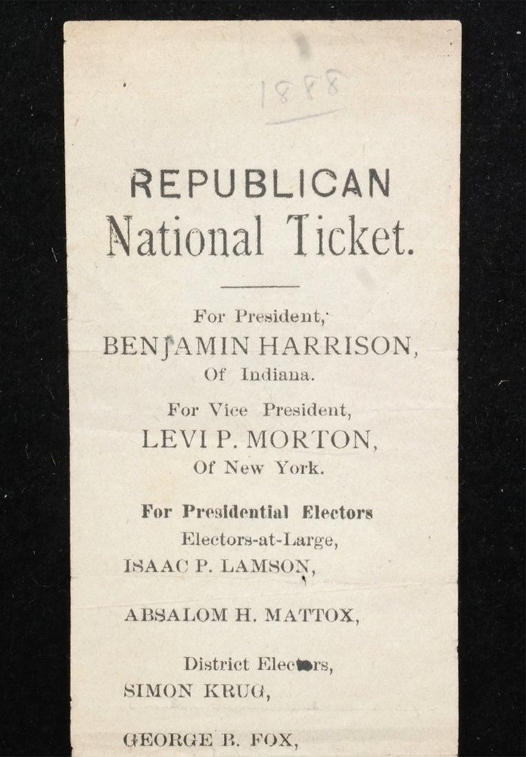 Comprises: 1.) Ohio "Republican National Ticket" with list of Presidential Electors below segregated into "Electors - at - Large" and "District Electors." 2.) Maryland pictorial "Republican Ticket. / Sixth Congressional District..." with list of Electors below. Features vignette depicting a waving U.S. flag with liberty cap topping pole. 3.) Maryland pictorial "Republican Ticket. / Sixth Congressional District..." with list of Electors below. Features vignette depicting a raccoon holding a pennant from its mouth with "Harrison & Morton" emblazoned across the front. 4.) Virginia "Regular Republican Ticket" with list of Electors at Large, District Electors, and a congressional candidate.