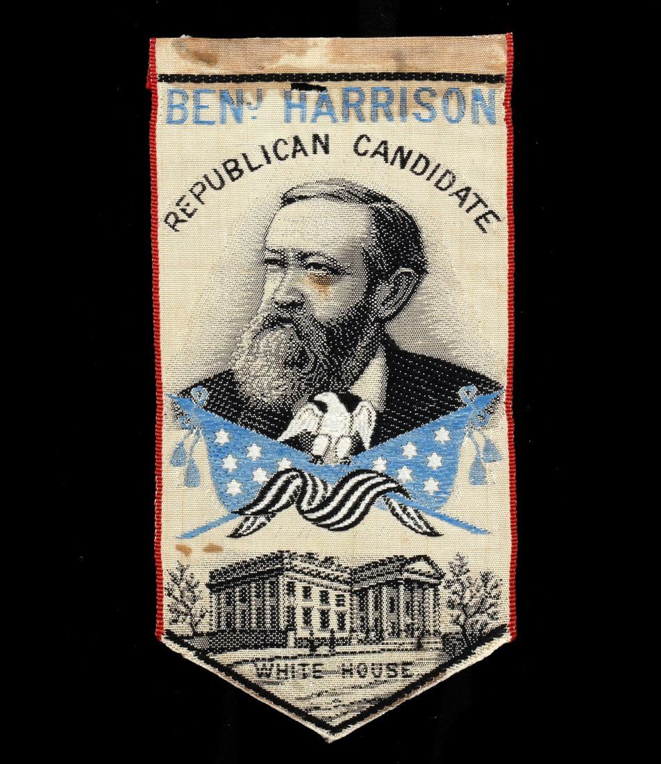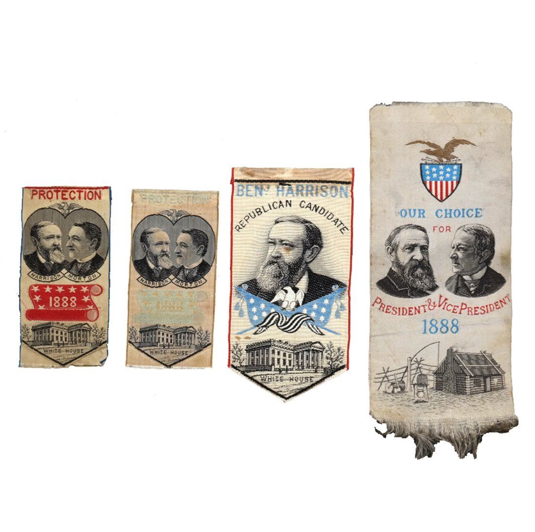 Comprises: 1.) Jugate portrait ribbon with gilt-stamped eagle and shield above, and log cabin below. Imprinted "Our Choice For President & Vice President." 2.) Ribbon with pointed bottom. Bears portrait of Harrison at center and depiction of the White House at bottom. 3.) Matched pair of ribbons, each with conjoined oval jugate portraits at center and depiction of White House at bottom. Imprinted "Protection / 1888."