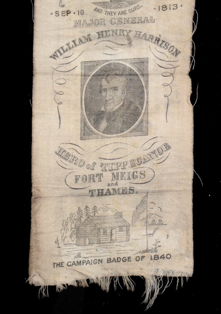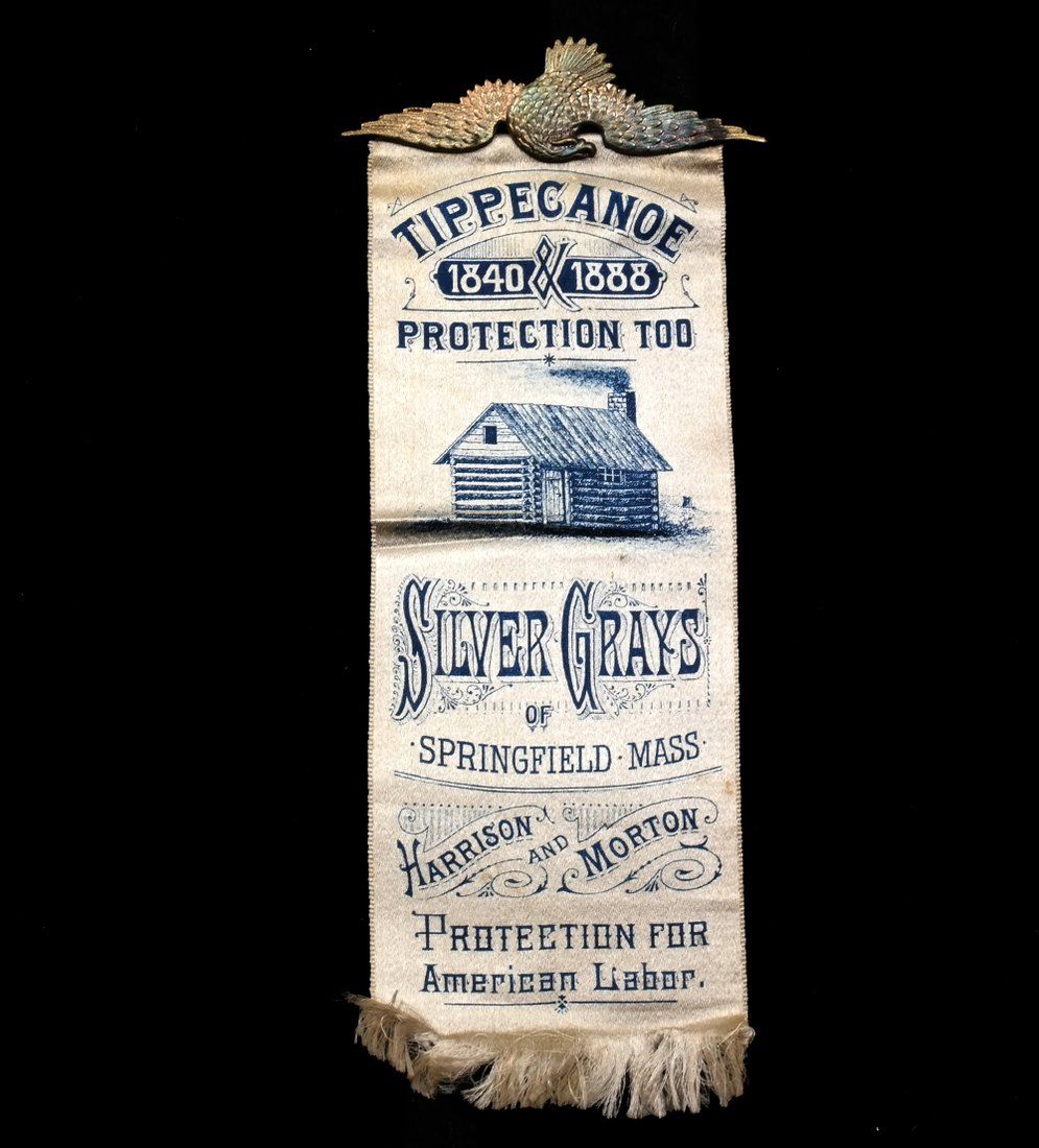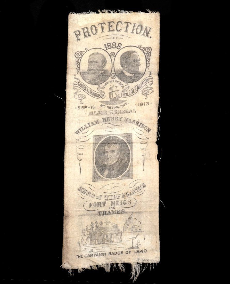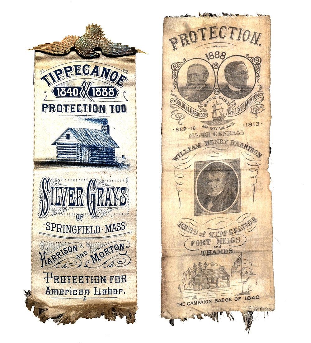 Comprises: 1.) Champagne-tone satin and blue ink ribbon. Features detailed log cabin vignette. Imprinted "Tippecanoe & Protection Too / 1840/ 1888 / Silver Grays of Springfield Mass. / Harrison & Morton / Protection for American Labor." Retains eagle-form pin back hanger. 2.) Printed cotton ribbon with candidates jugate above a a portrait of William Henry Harrison imprinted "Hero of Tippecanoe and Thames. Includes a vignette of a warship with legend "We Have Met The Enemy And They Are Ours" and a log cabin with imprint "The Campaign Badge of 1840."