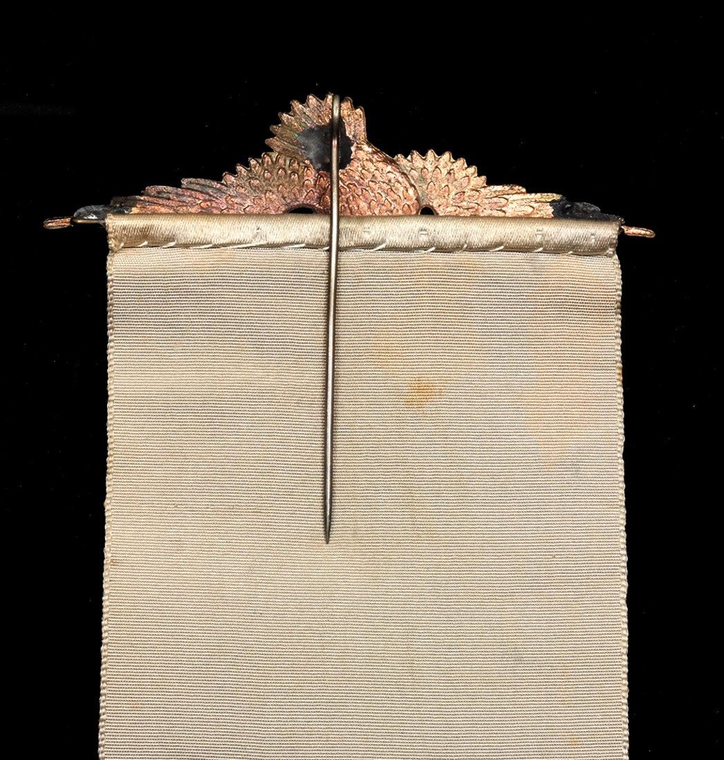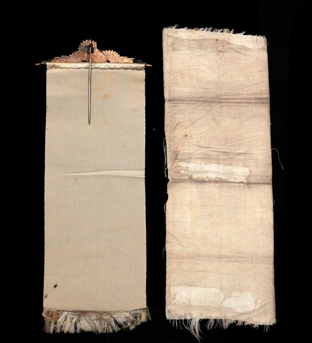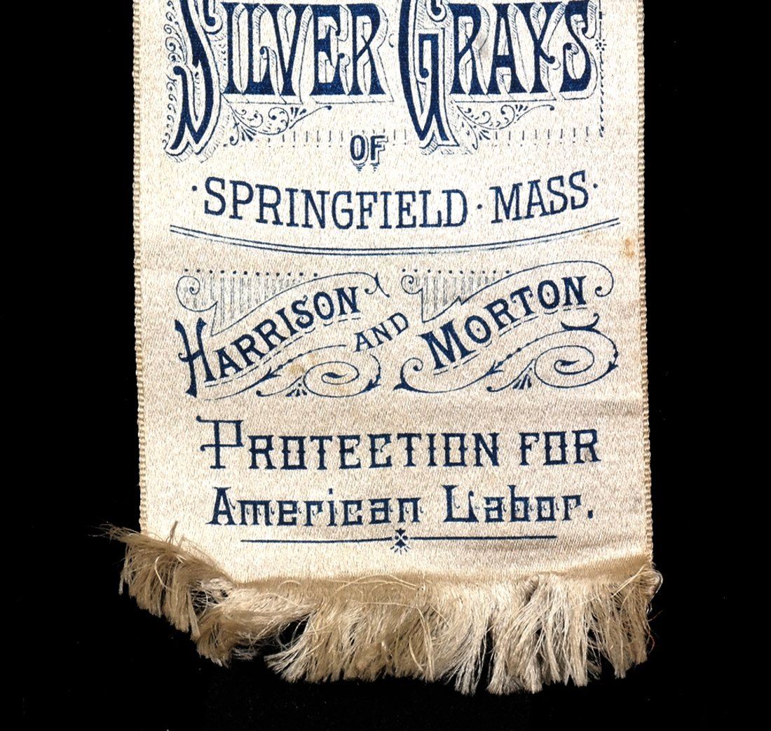 Comprises: 1.) Champagne-tone satin and blue ink ribbon. Features detailed log cabin vignette. Imprinted "Tippecanoe & Protection Too / 1840/ 1888 / Silver Grays of Springfield Mass. / Harrison & Morton / Protection for American Labor." Retains eagle-form pin back hanger. 2.) Printed cotton ribbon with candidates jugate above a a portrait of William Henry Harrison imprinted "Hero of Tippecanoe and Thames. Includes a vignette of a warship with legend "We Have Met The Enemy And They Are Ours" and a log cabin with imprint "The Campaign Badge of 1840."
