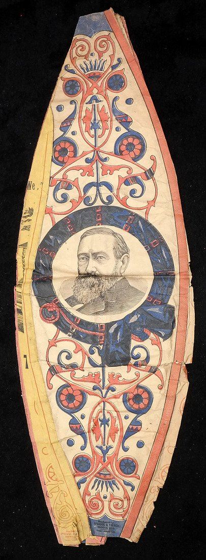 Two "Beach-ball" eight-sided printed paper lanterns supporting 1888 Republican presidential candidate Benjamin Harrison and running mate Levi P. Morton. Features stars, eagles, floral patterns, etc. Bears portraits of candidates, image of log cabin, Protection and Tippecanoe slogans.