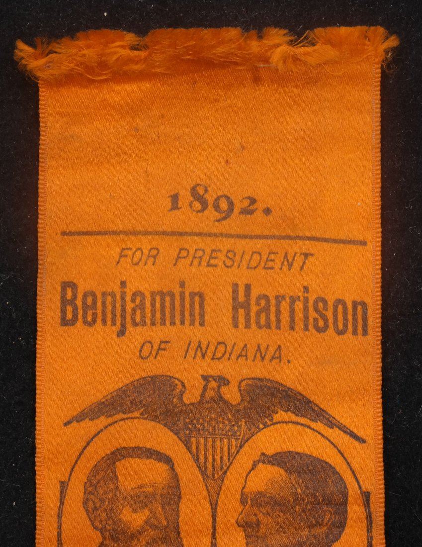Comprises: 1.) Silk red, white, and blue stevengraph ribbon. Bears candidates portraits at center with their names below. Text relates: "Republican Candidates" at top and below "Protection to American Industry." Imprinted at extreme top edge "Hand & McGuinness, Paterson, N.J. / George R. Osborn, New York Sole Agent." 2.) Orange satin ribbon with black ink imprint. Features jugate portraits flanked by federal eagle at top and U.S. flags at bottom. Text relates: "1892 / For President / Benjamin Harrison of Indiana" at top and below "For Vice-President Levi P. Morton of New York / 1892."