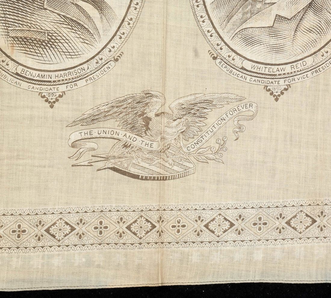Two printed blue cotton jugate campaign bandanas with jugate portraits of incumbent Republican Benjamin Harrison and running mate Whitelaw Reid. Shields imprinted "The Union and the Constitution Forever" Decorated with eagles, shields, geometric patterns, etc.