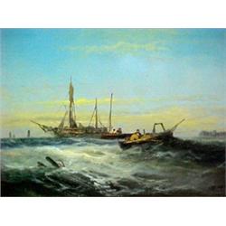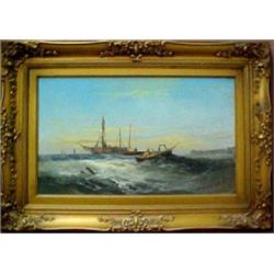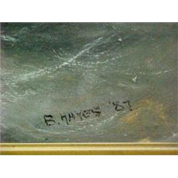 B. Hayes (Barton Stone Hayes), oil on panel "Ships on a Turbulent Sea", signed B. Haynes '87 (L.R.), listed American 1826-1914, see paper label on reverse, framed, image measures 12" x 20"