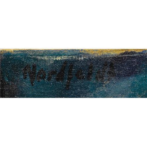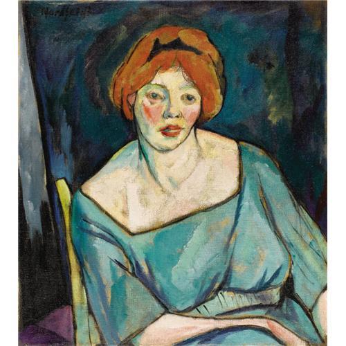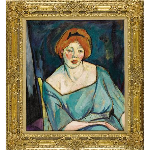 <B>BROR JULIUS OLSSON NORDFELDT</B></I> (American 1878-1955)<BR><I>Woman with Orange Hair,</B></I> circa 1916<BR>Oil on canvas<BR>27-3/8 x 24-3/8 inches (69 x 61 cm) <BR><BR>Nordfeldt was born in Tullstrop, Sweden. In 1891 his family left the country to settle in Chicago. In 1899, Nordfeldt attended the Art Institute of Chicago and assisted Albert Herter on a mural commission for the McCormick Harvester Company. The following year the company sent Nordfeldt to Paris to view the mural upon its showing at the Paris Exposition of 1900. For the next three years, Nordfeldt lived primarily in Paris. At first he enrolled at the Académie Julian, but left after only two weeks because he was dissatisfied with the academic training. Instead, he , found a job teaching painting to young German art students and spent time in Reading, England, where he studied woodblock cutting and printing. For most of 1903, Nordfeldt lived in Sweden. During the next seven years he lived for periods in Chicago, France, Germany, Sweden, England, Morocco, Spain and Italy. During these years he worked extensively as an illustrator, completing numerous assignments for <I>Harper's Magazine</B></I> and <I>The Outlook.</B></I> <BR><BR> Woman with Orange Hair dates from the period 1912-1916. By this time Nordfeldt had cast aside the low-toned Whistlerian tonalism of his early paintings and began to adopt the brilliant color and daring formal simplification of French Post-Impressionism. This was prompted by a growing awareness of Matisse and the Fauves, whose work he would have seen at the Salon d'Automne in 1908. In addition to Matisse, Nordfeldt was greatly enamored with the art of Cézanne and Gauguin, and appears to have taken an interest in the figurative paintings of Alexei von Jawlensky. <I>Woman with Orange Hai</B></I> belongs to a series of portraits dating from the 1910s in which Nordfeldt applied paint with quick strokes of pure color, often used a palette knife, traced black outlines around forms, and treated space in a compressed manner. In these portraits Nordfeldt usually emphasized vibrant tones of green, yellow and orange. The series includes artist friends, people involved with the cultural scene in Chicago, and professional models. <B>Condition Report:</B> Normal signs of wear as appropriate with age; reinforced canvas and a 2-1/2 x 2-3/8 inch patch in the upper right quadrant on verso; together with scattered strengthening along the lower edge, face and neck; with a 2 inch vertical repair connecting to a 1-1/4 inch horizontal repair just above her right shoulder; cleaned and with some craquelure.<BR><BR><b>Shipping:</b> Requires 3rd Party Shipping (<a target="_blank" href="http://www.heritageauctions.com/common/shipping.php">view shipping information</a>)