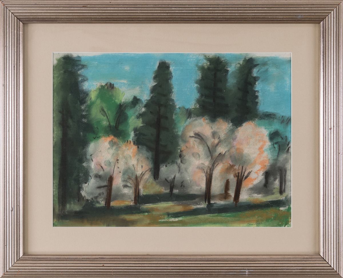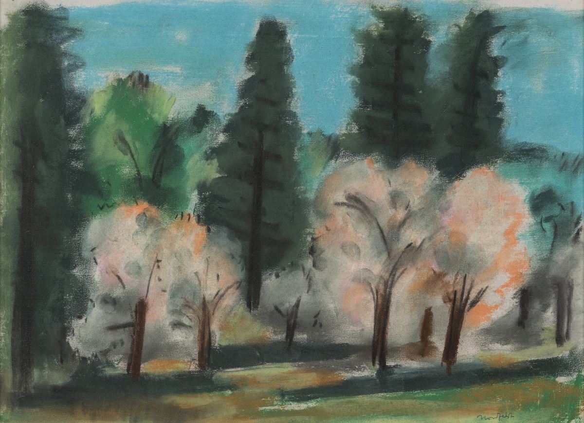 B. J. O. Nordfeldt (1878-1955). Spring Orchard. 10 ½" x 14 ½" pastel. Signed lower right.