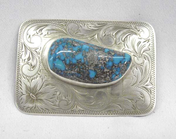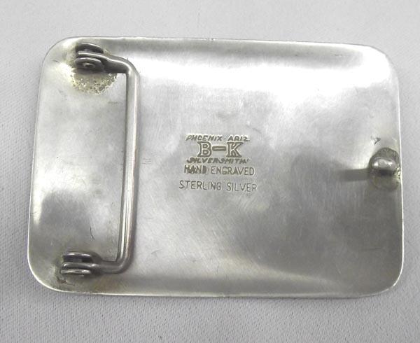 B-K Silversmiths Sterling Turquoise Engraved Belt Buckle hallmarked B-K Silversmiths Phoenix AZ hand engraved sterling silver, natural turquoise stone which measures 1.75'' x 1'', buckle measures 3'' x 2 1/8''. Buyers Pay Actual Shipping and Handling Charges(see terms and conditions for more information)