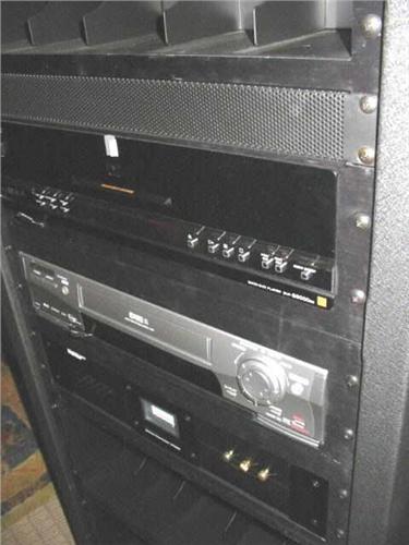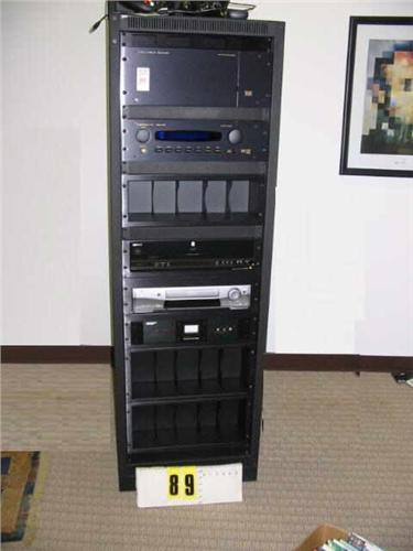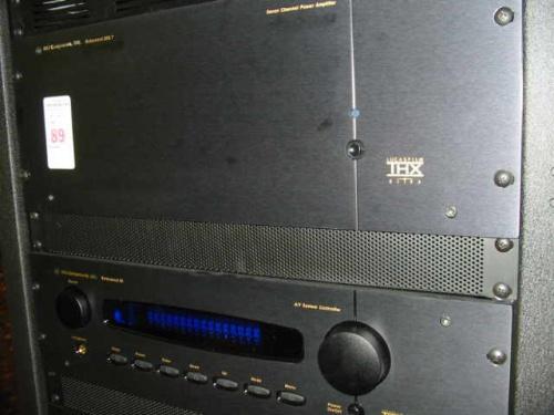 B&K components tower with 7 channel power amplifier Lucas film IHX ultra ref #200.7, A/V system controller ref 50, Sony DVD player S9000ES, Mitsubishi VCR, Monster power home theater power center HTS 3500