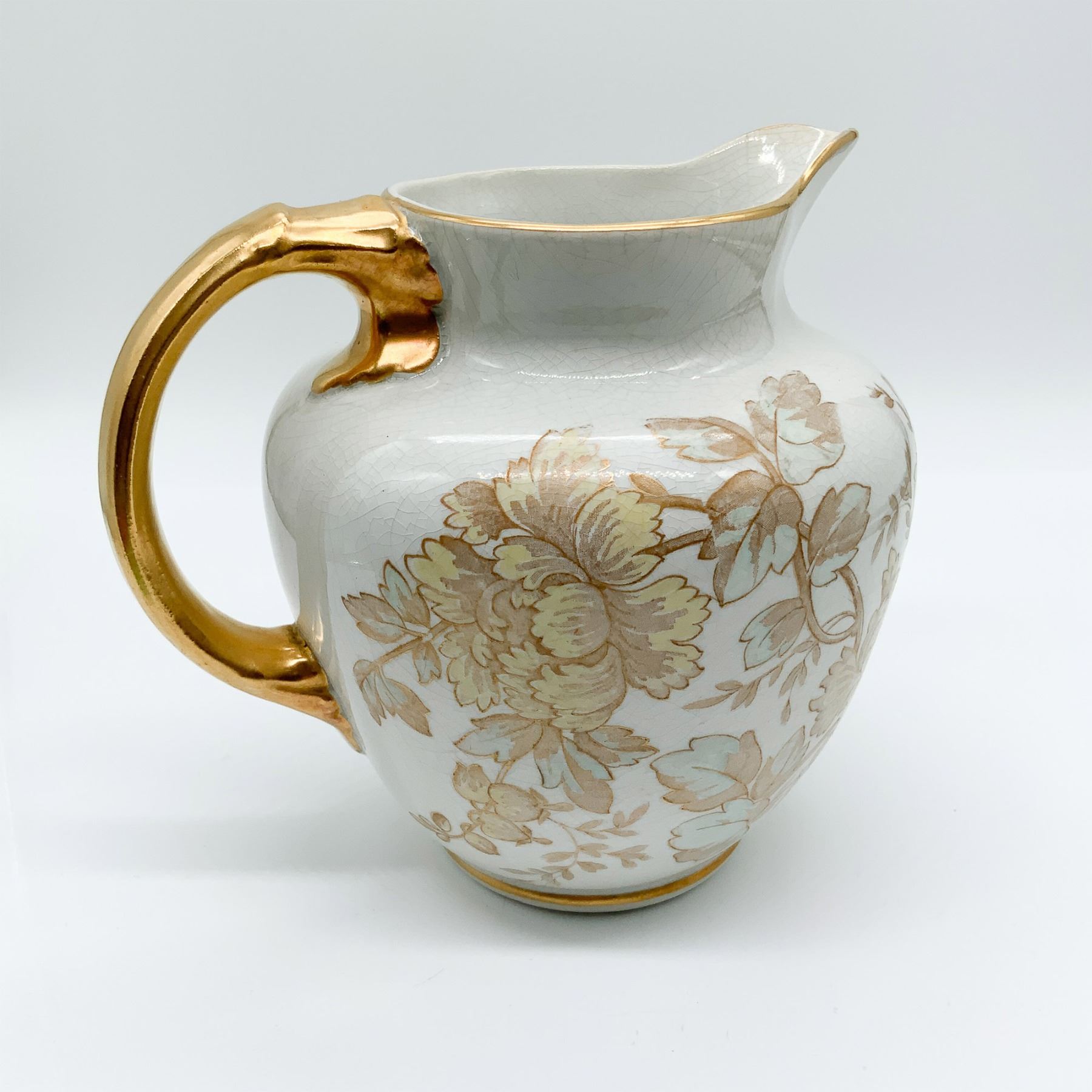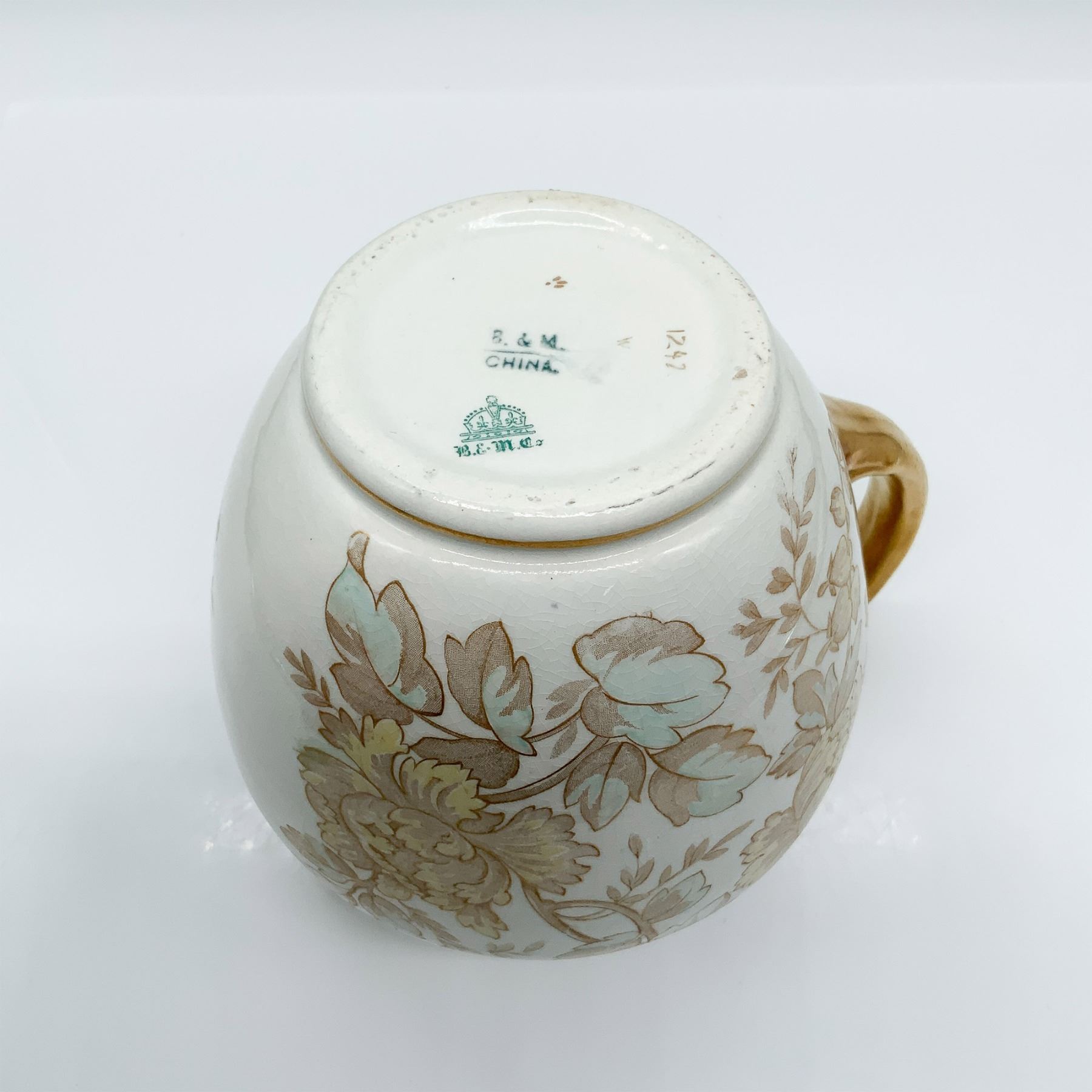 Vintage porcelain pitcher by B & M China, featuring an intricate gold floral design and a glossy crackle glaze finish. The curved handle is adorned with gold accents, adding a refined touch to this elegant piece. The underside bears the backstamp "B & M China" along with "B.E.M.C" and a crown symbol, reflecting its heritage. Measuring 6.5 inches high, this pitcher is a fine example of early 20th-century craftsmanship, making it a charming addition to any collection of decorative porcelain.