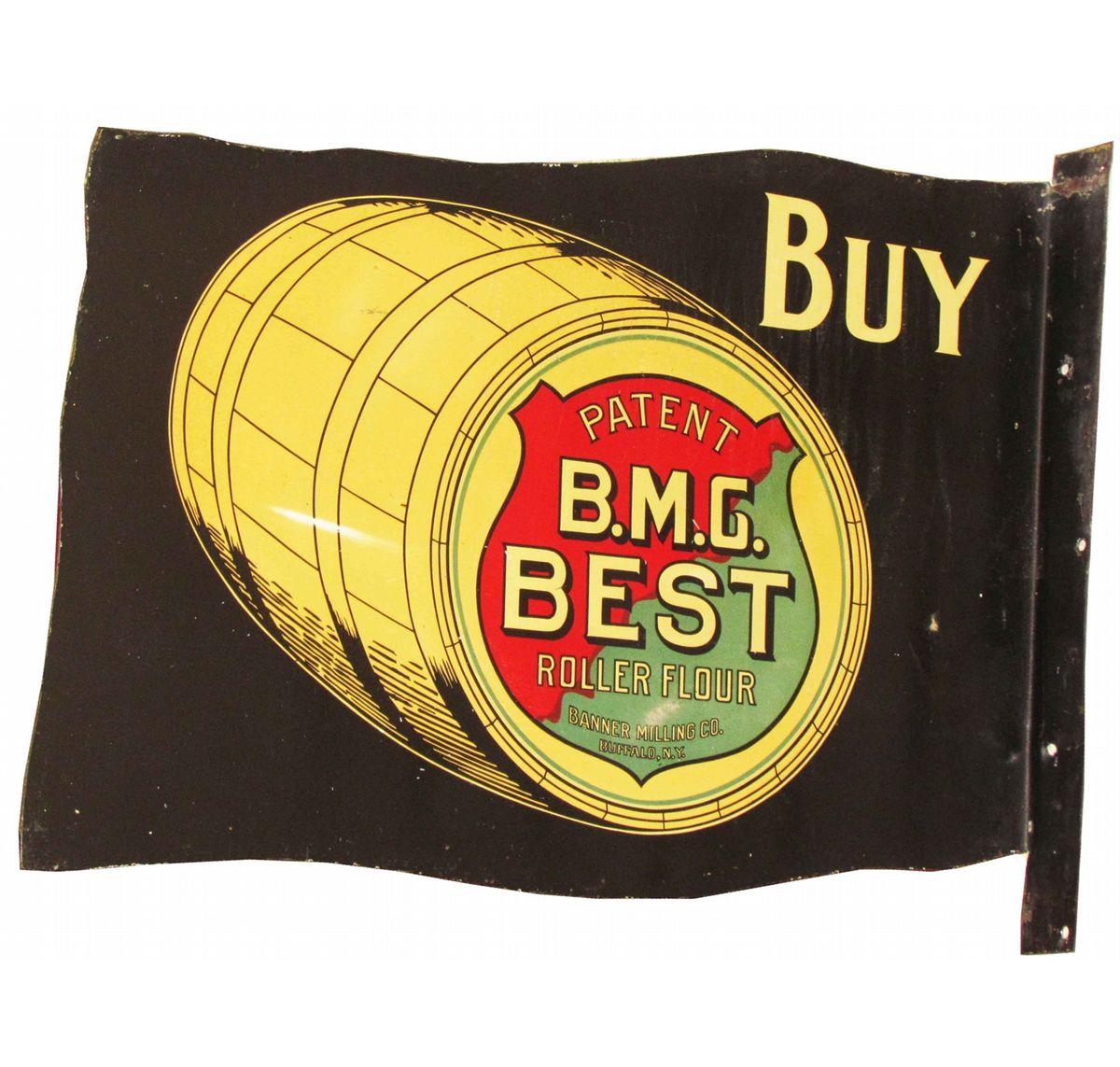 B.M.G. Best Flour Tin Flange Sign. A few rubs and some edge wear otherwise excellent condition. 18 X 12 inches.