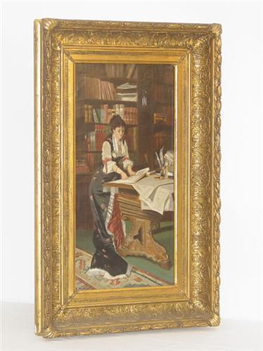 B. MICHLER OIL ON CANVAS OF LIBRARY W/ BOOKS, CARVED FURNITURE & A LADY IN FANCY CLOTHES-SIGNED B. MICHLER ON LOWER LEFT IN A GILT CARVED PLASTER FRAME (20 1/4" X 9 1/2") - PROFESSIONALLY RESTORED W/ PATCH, RELINED, IMPERFECTIONS