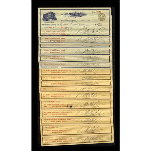 <B>B. Max Mehl 1929 Check Hoard</B></I> including ten cancelled checks on his Fort Worth National Bank checking account and six checks on his Texas National Bank account. Each check displays his signature and a vignette of the Mehl Building which still stands today. One check is noticed that Mehl wrote to himself.
