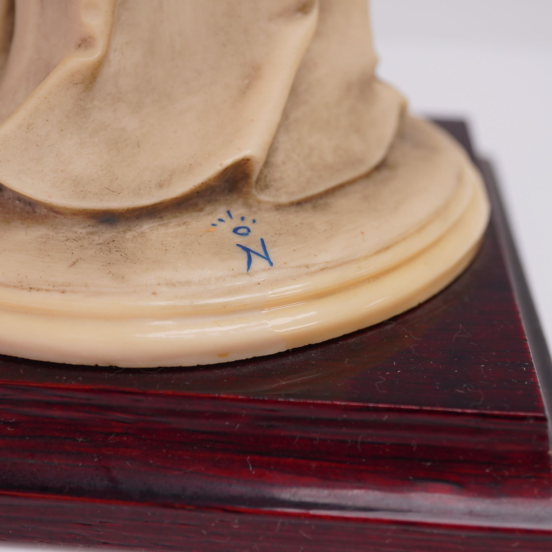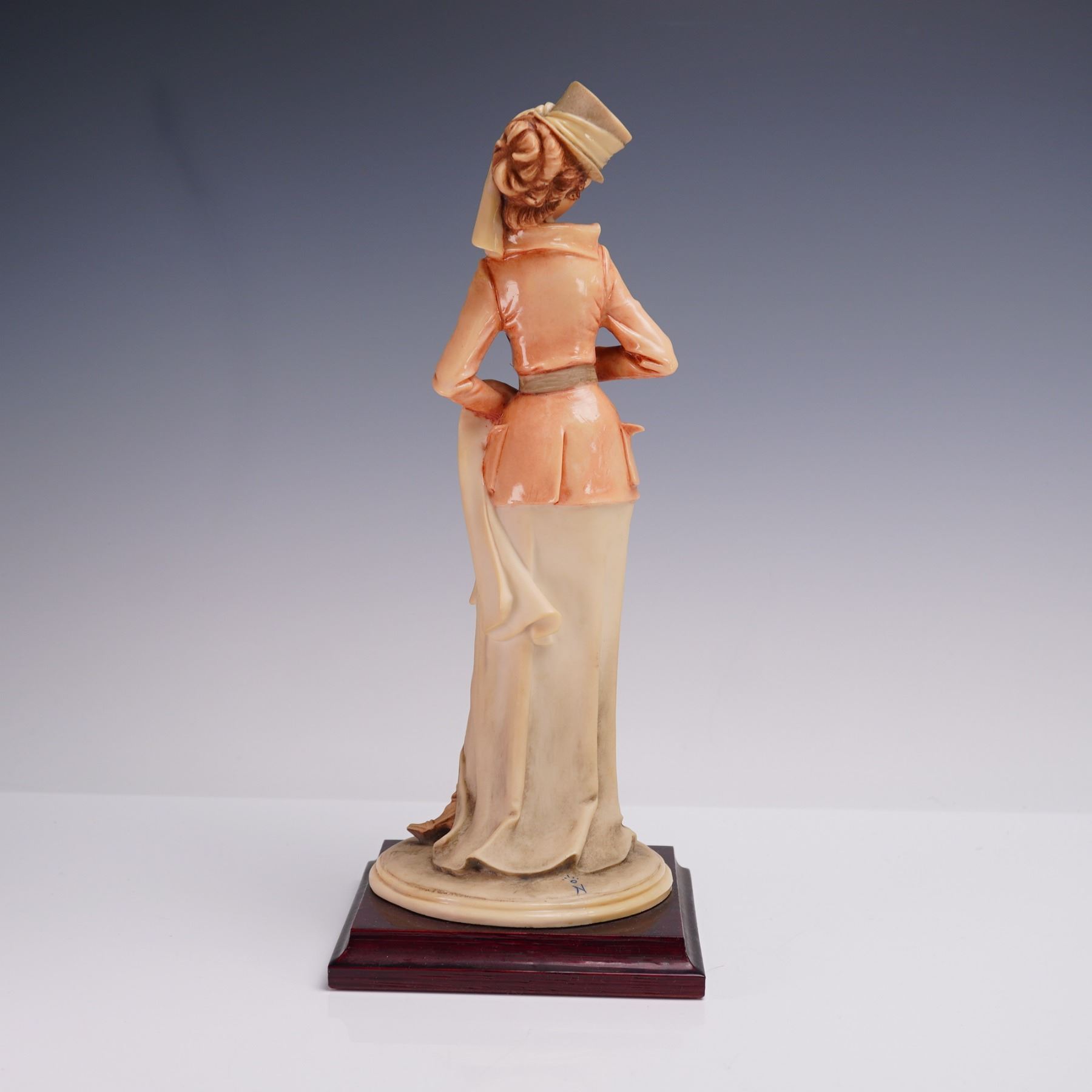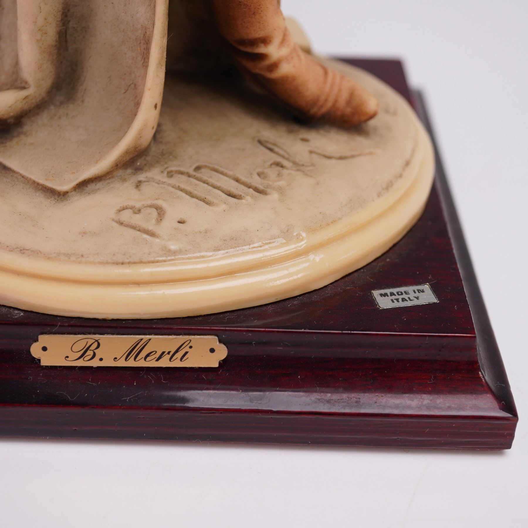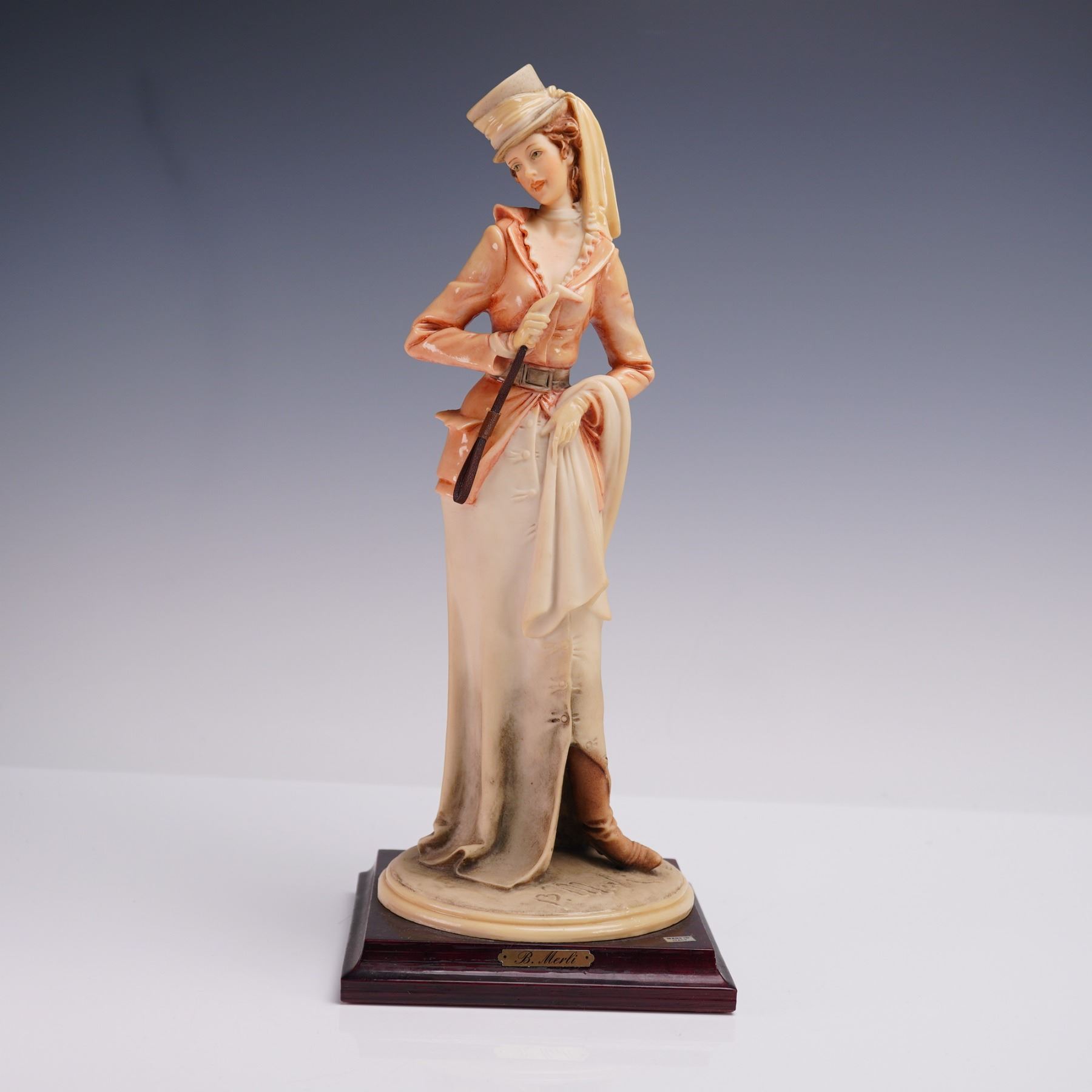 Signed B. Merli sculpture from Florence Sculture d'Arte, made in Italy and mounted on a polished wood base with felted bottom. The figure depicts a graceful lady in Edwardian-style dress, with a belted peach jacket, long cream skirt, and a matching wide-banded hat with veil. Sculpted in bonded marble or resin with a light antiqued finish, the base is signed and stamped with the Florence crown and N hallmark. Measures approx. 13"H.
