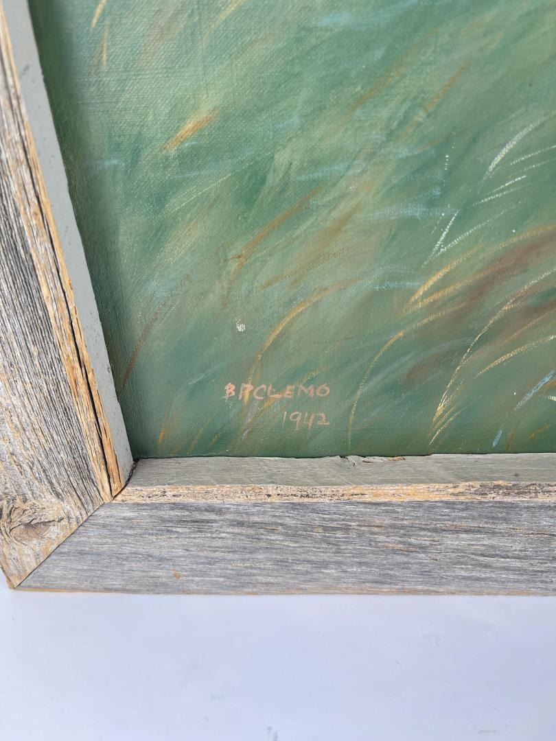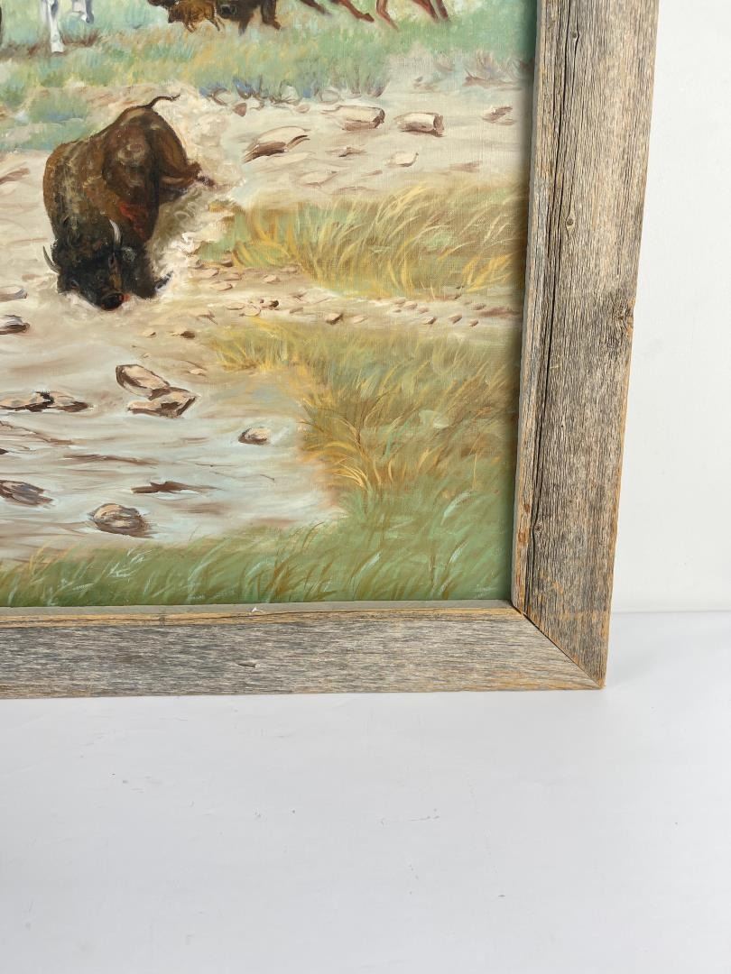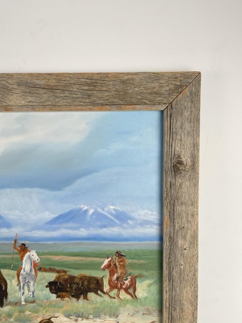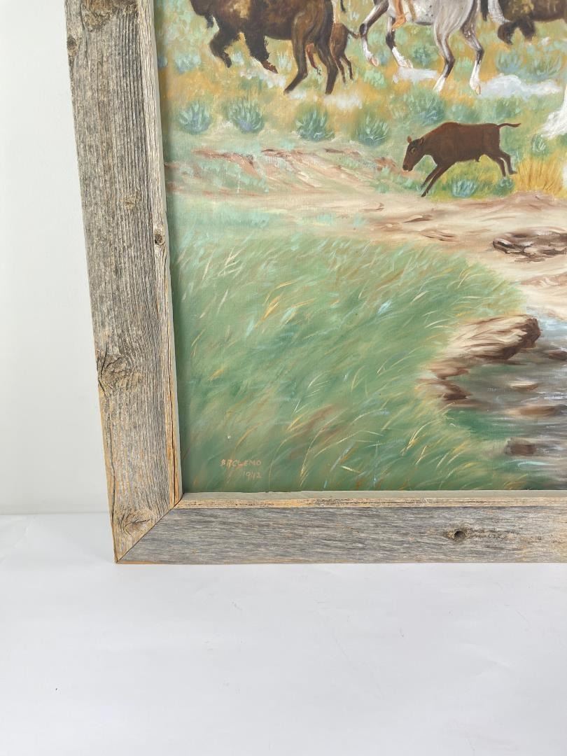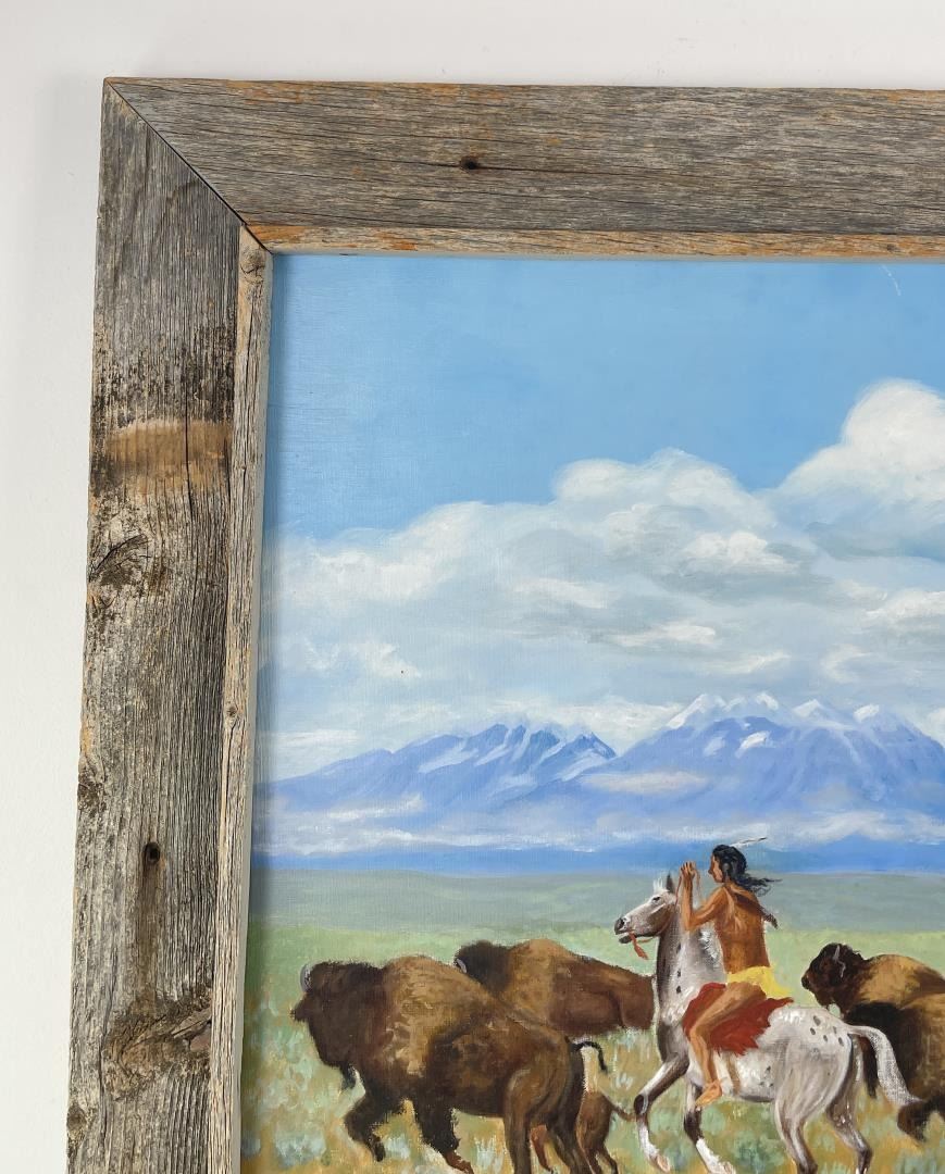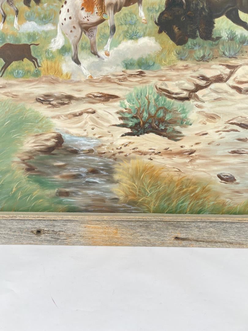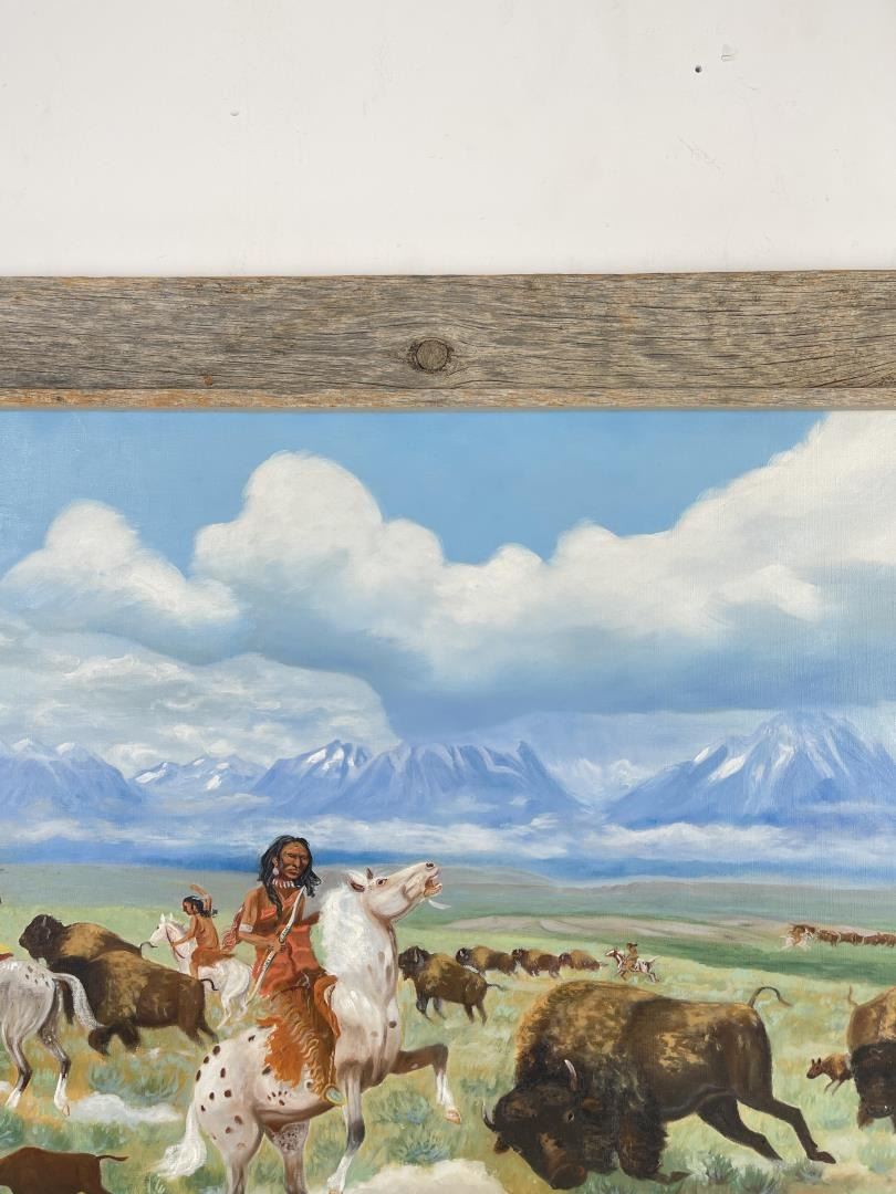 Indian Prairie Buffalo Hunt. 42" by 56" framed. BP Clemo was from Walkerville Montana.