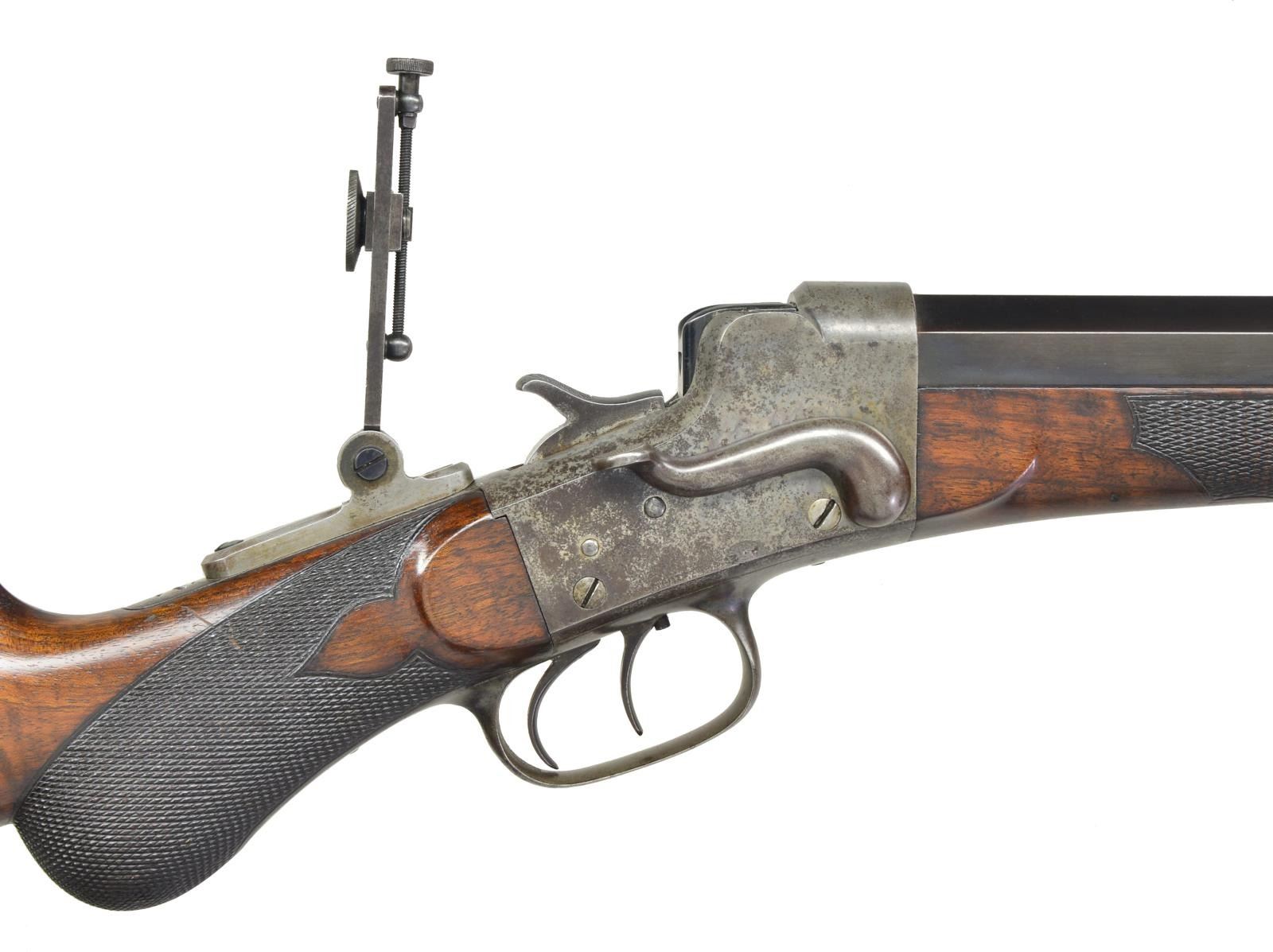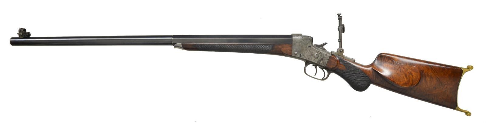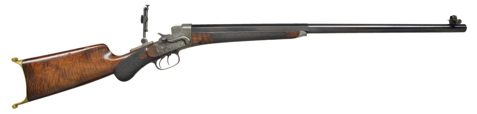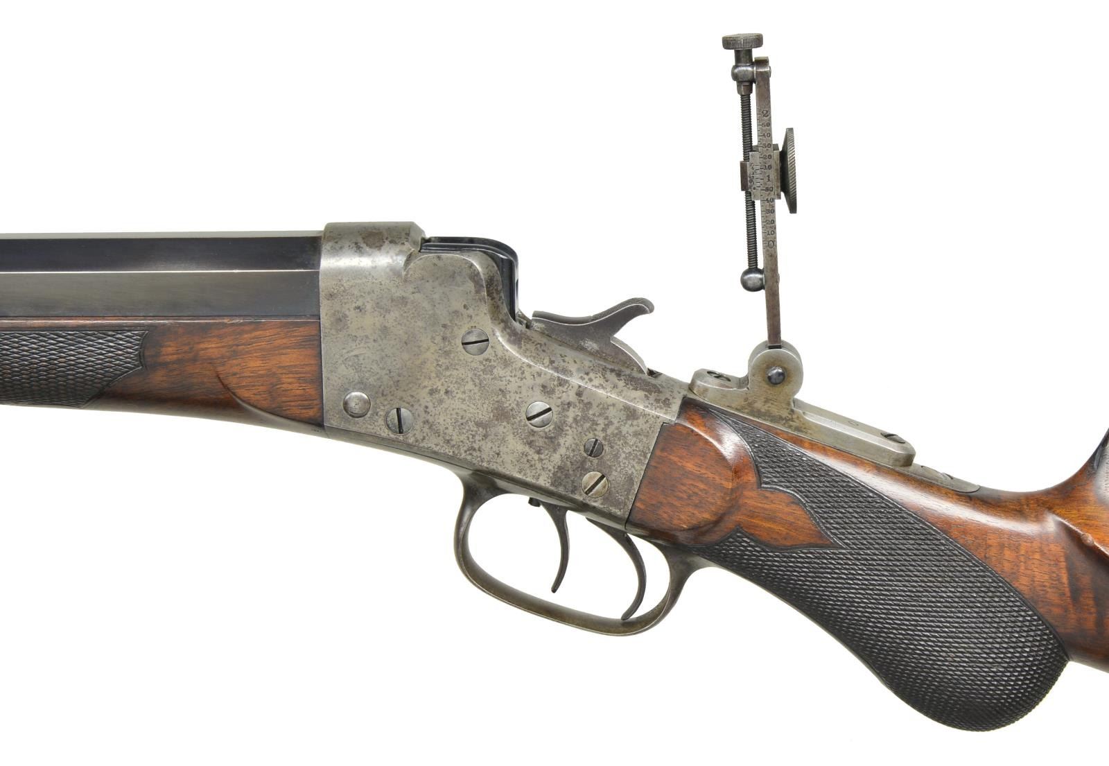 Cal. 38-40 Remington Hepburn. S# 2928. The "B" quality was the higher grade of Hepburn rifle and had fancy wood and better sights. The 28" half round half octagon bbl. has Remington name and address stamped on top. Cal. marking "38" is on bottom. Bbl. is uncut for rear sight dovetail and is fitted with windage adjustable globe front sight without spirit level. Serial number is on bottom flat under forend. Case hardened Hepburn action is unmarked on sides and is not serial numbered. It is fitted with double set triggers. A mid range vernier sight is on top tang. Round knob buttstock of attractively crotch figured American walnut is fitted with brass swiss style offhand buttplate, high comb, and small swept cheekpiece. Checkering at grip is of semi fancy pattern. Matching checkered forend has schnabled steel tip. CONDITION: good to fine as partially refinished, bbl. retaining most of what appears to be a good quality rust reblue. Action retaining a considerable amount, as much as 20%, original case hardening color is mostly mottled gray and brown. Trigger guard and tang considerably browned. Stocks retain most of what appears to be their original oil finish with a few minor marks and one or two fairly deep gouges on butt. Checkering is somewhat worn, especially on forend. Bore is fair to good. Fairly shiny with scattered pitting, mostly at breech end. Mechanically good. (01-21587/MGM). ANTIQUE. $6,500-9,500.
