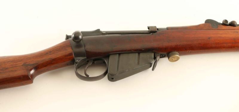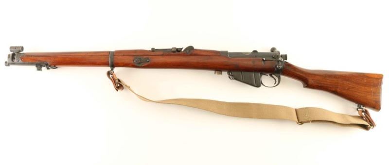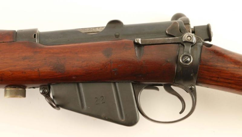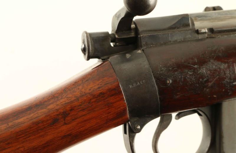 SN: 2168 British single shot bolt action sporting rifle chambered for .22 caliber rimfire, manufactured circa 1900's. Features a blued finish, 25.2" sleeved barrel, Parker Hal FS 22 globe front sight, adjustable leaf style rear sight graduated to 2,000 yards, volley sights, metal nose cap with bayonet lug & piling swivel, serrated trigger, "22" marked 'magazine' with a feed ramp follower and brass collection area, manual safety on the left side of the receiver, tan canvas sling, smooth full-length wood handguard with integral protective ears for the rear sight, forend with a Parker Hale sight insert container mounted and straight grip shoulder stock with brass disc & brass trapdoor buttplate. The right side of the butt socket is marked 'B.S.A. Co" & the barrel is stamped "PARKERIFLED," [stacked rifled]/"BSA," "R R." & nitro proofs for .22LR. The serial numbers match on the receiver, barrel, bolt and rear sight. Rifle retains approximately 75% of it's blued finish showing a light surface rust and thinning with brown patina making up the balance. Action is smooth, the bore is excellent and the wood stocks are good+. Condition is NRA Good+ ***C&R Firearm*** From The John F Sukey Collection