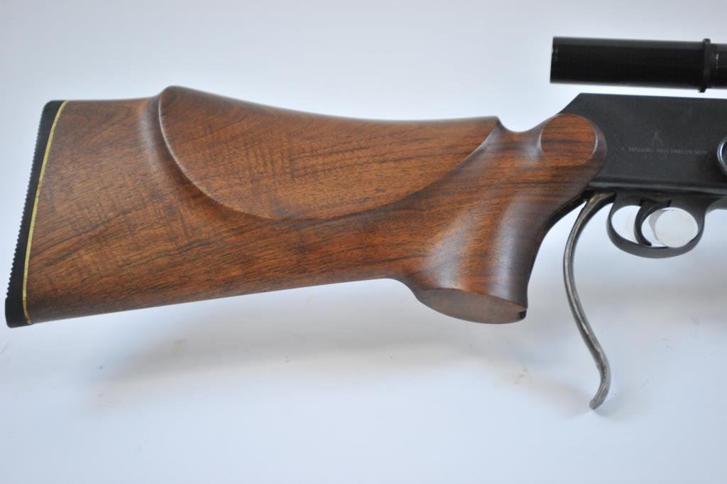 S/N UB130 with 29 ¼” heavy round barrel, adjustable front swivel and 24x Redfield scope on stationary barrel mounts. Left handmade Monte Carlo cheek piece (But would shoot right handed). Fine to excellent used condition. 98%-99% overall with excellent bore. Slight use only. (C&R) Est.: $700-$1400