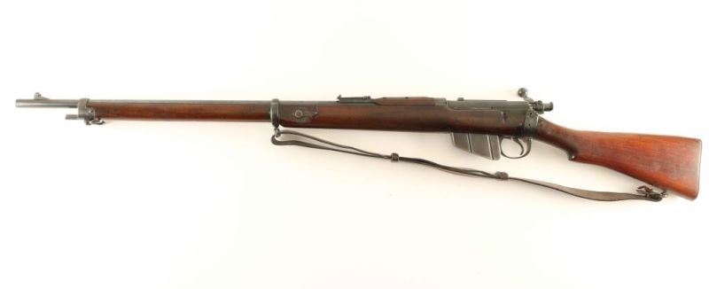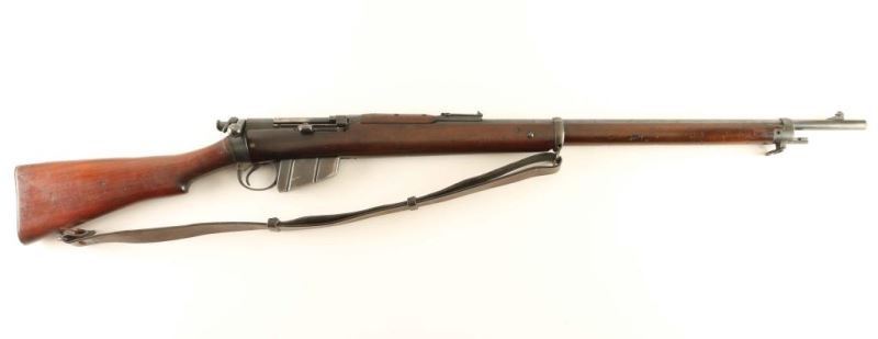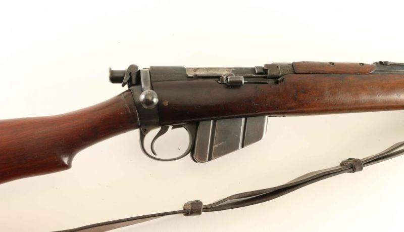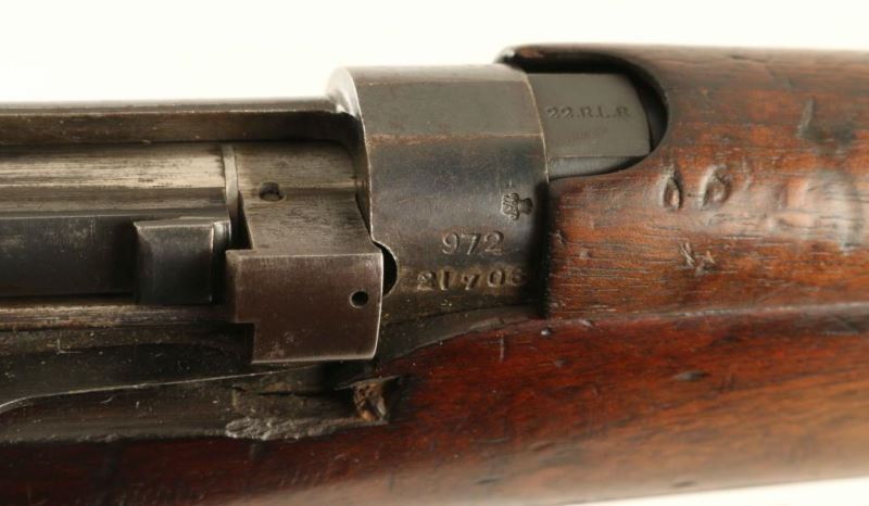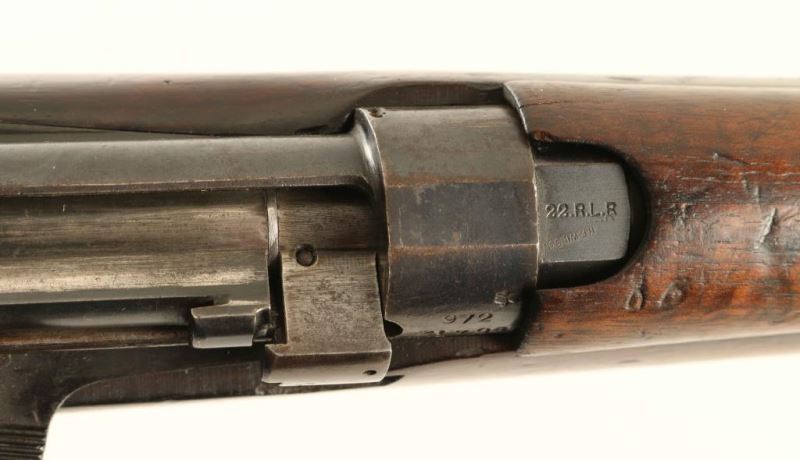 SN: 972/217061 British single shot bolt action sporting rifle chambered for .22 caliber rimfire, manufactured circa 1900's. Features a blued finish, 30.2" barrel, ramped patridge front sight, latter style rear sight graduated to 1,800 yards, front volley sight, metal forend cap with bayonet lug & piling swivel, serrated trigger, hollowed .303 magazine/.22 brass collector, modified magazine cut-off that acts as a bolt stop, modified bolt head, manual safety on the bolt, brown leather sling, smooth wood handguard, full-length forend and straight grip shoulder stock with long tang brass trapdoor buttplate. The right side of the butt socket is marked 'B.S.A. Co" & the barrel is stamped "THE LONDON SMALL ARMS Co Ltd/LONDON/1907," "22.R.L.R," "162" & "H.B. WILSON." The serial numbers 972 are found on the receiver, bolt hand and rear sight. Rifle exhibits approximately 85% of it's blued finish with edge wear, thinning and a small amount of scattered rust on the barrel. The rear barrel band does not fit securely. Action is smooth, the bore is very good+ and the wood stocks are good with blemishes & a loss to the right side of the forend. Condition is near NRA Very Good ***C&R Firearm*** From The John F Sukey Collection