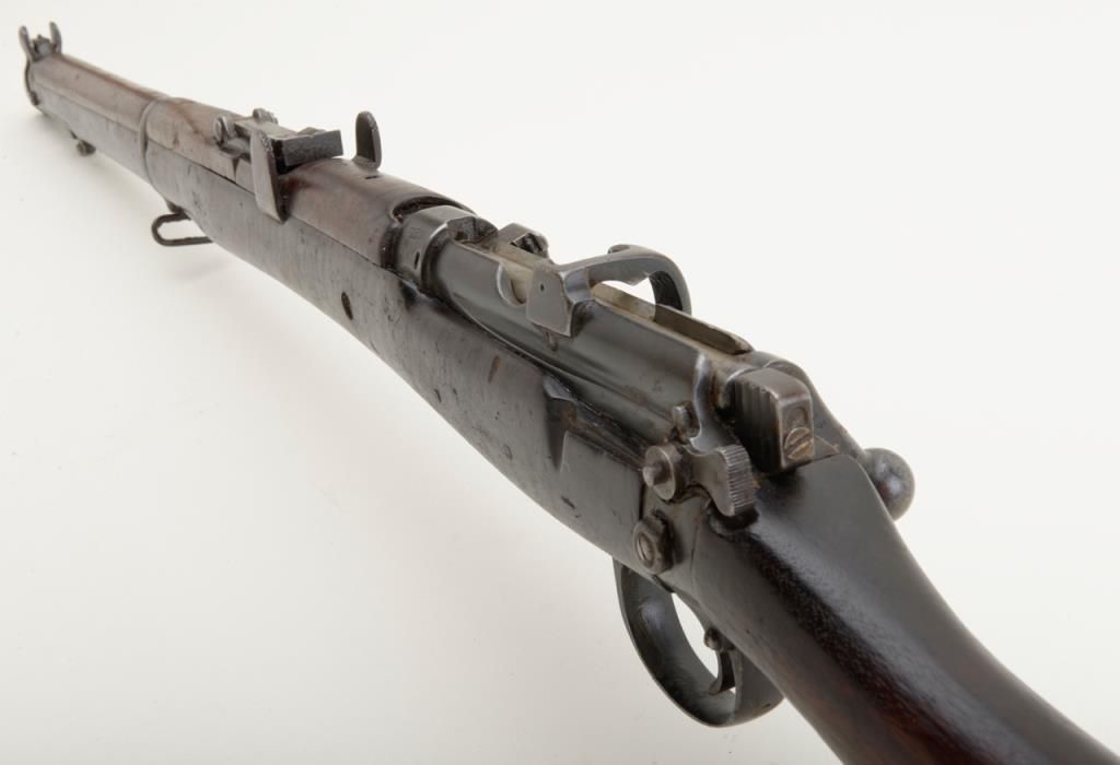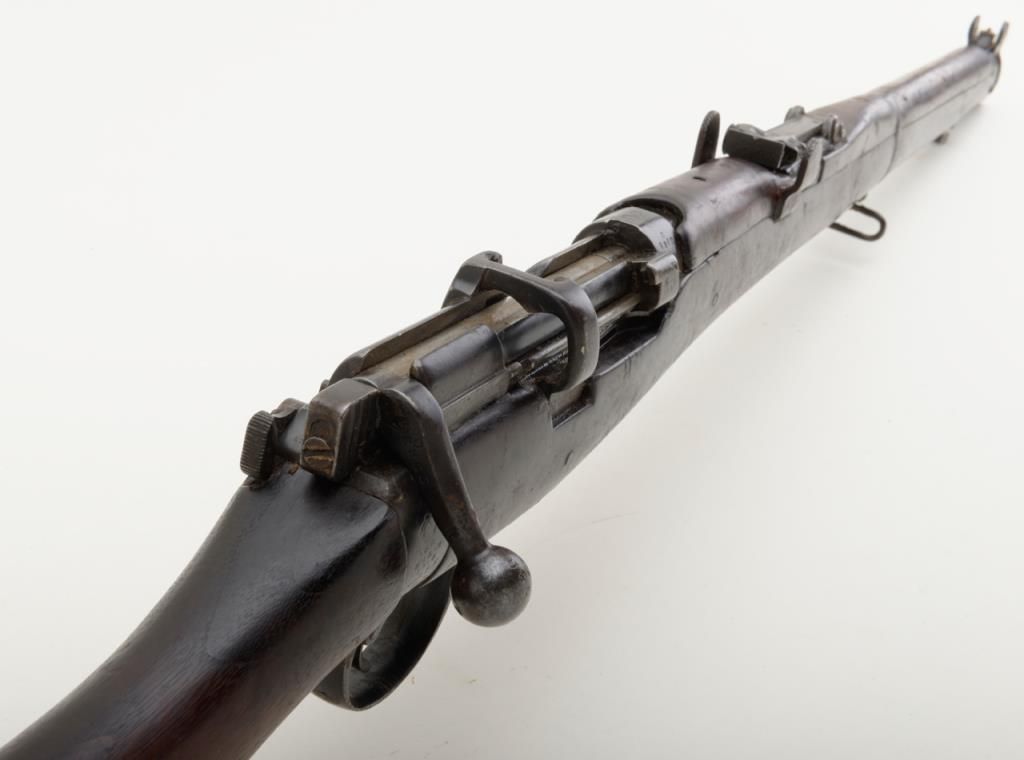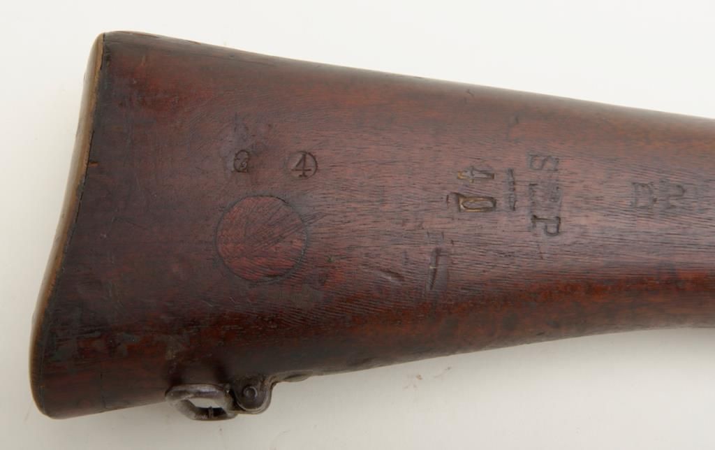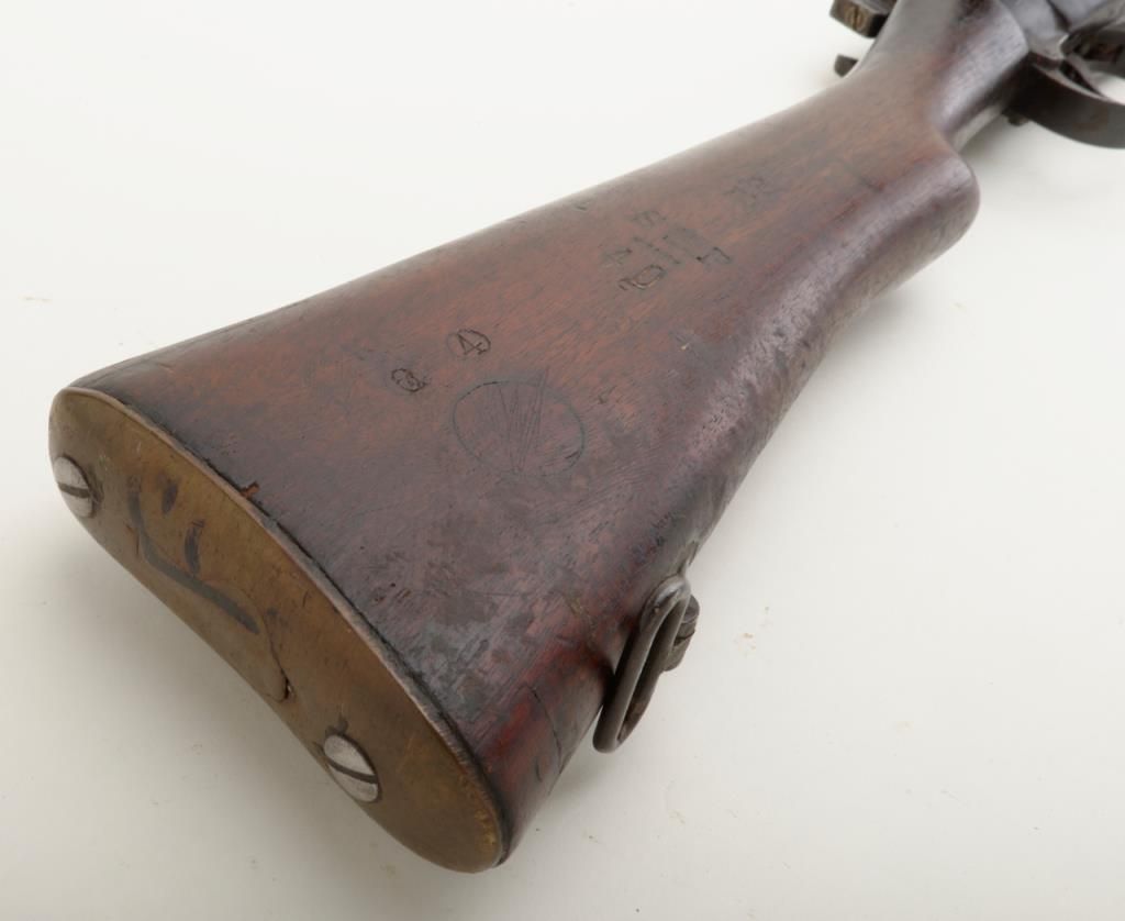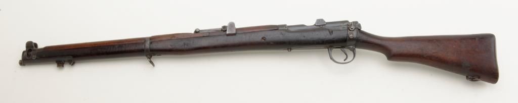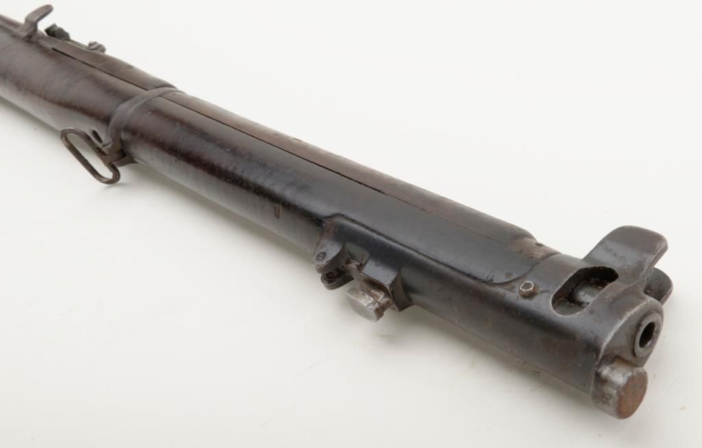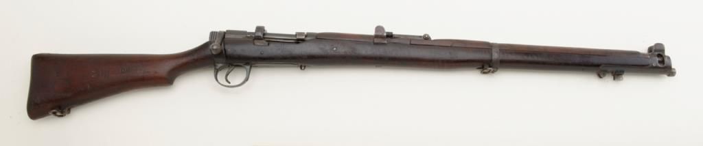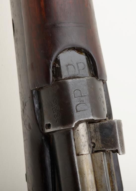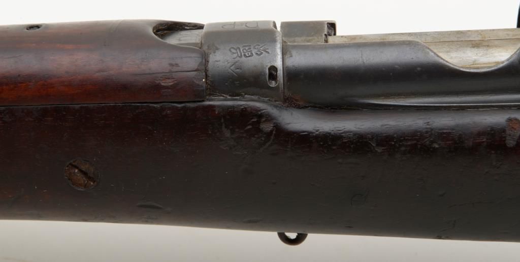 B.S.A. bolt action military “Drill Rifle”, .303 cal., (in-operable as features a firing pin with no tip and face welded closed; 25” barrel, military finish, full length wood stock, #O 8866 in fair condition showing the magazine “port”closed off with a piece of wood (some time ago) and a stationary action interior; wood is worn with “DP” stamp and other markings; some scattered old repairs. (C&R). Est.: $100-$200.