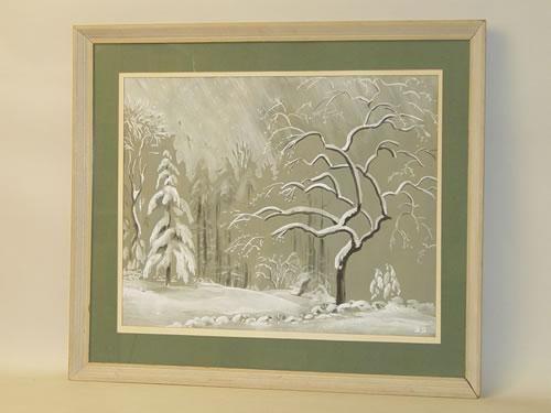 B. SAGENDORPH WATERCOLOR-GOUACHE PAINTING-BLACK & WHITE WINTER LANDSCAPE ON GREEN ARTIST'S PAPER SIGNED B.S., MATTED IN A PAINTED FRAME (18 1/4" X 23 3/4") - WRINKLING, 1/4" EDGE TEAR, IMPERFECTIONS