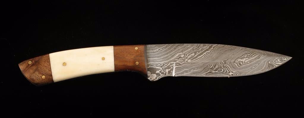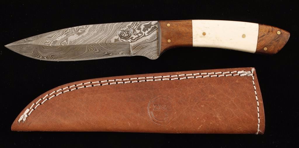 Custom deer bone and walnut wood handle. The drop point blade is approx. 5" and the handle is approx. 4.5". The blade is custom forged, hand pounded/folded steel with 180-200 layers of 1095 and 15N20 steel. A high quality leather sheath is included. Everything is USA handmade within the family. Kevin Johnson DBA DNZ Trading Co., Vista, CA.
