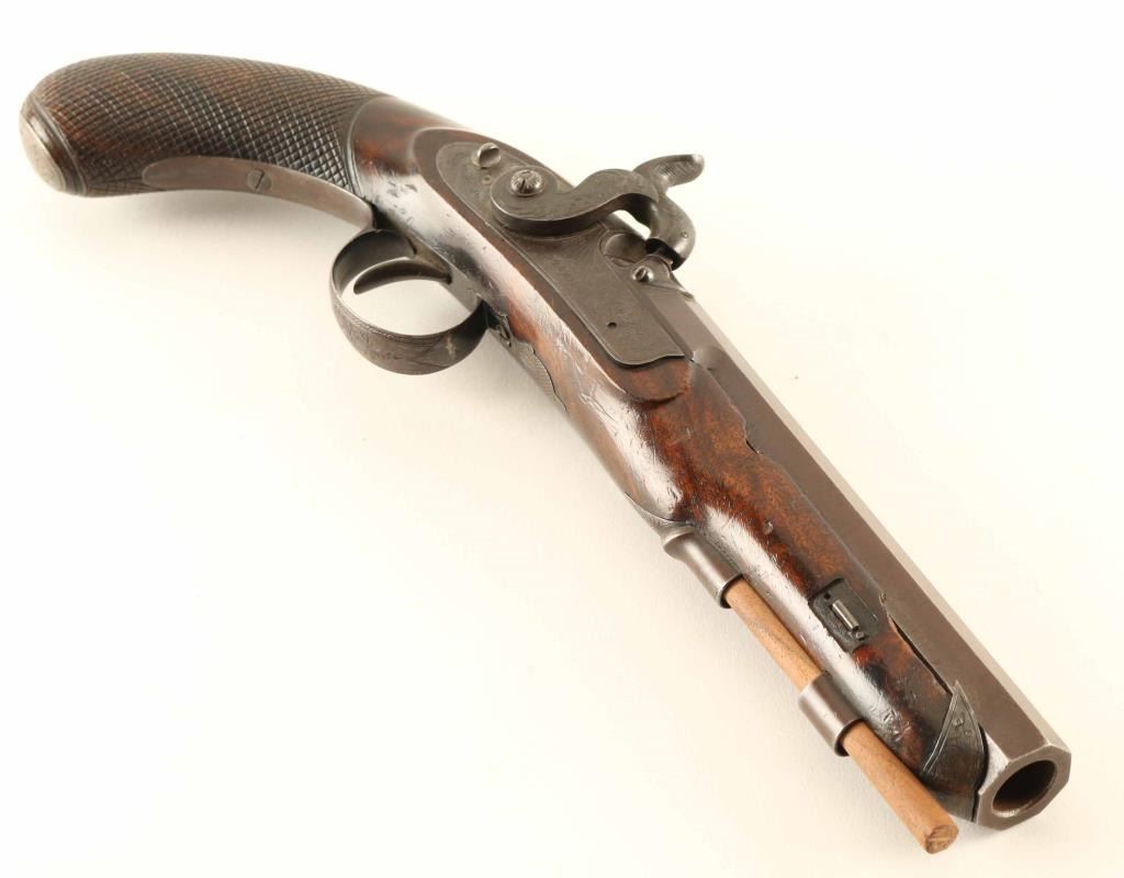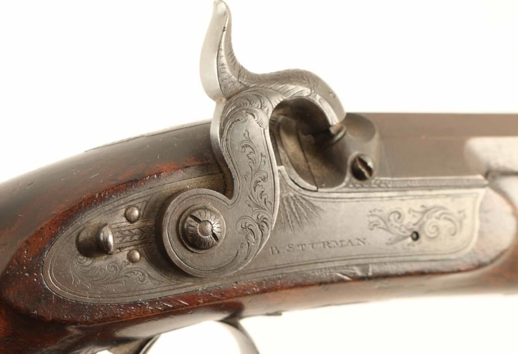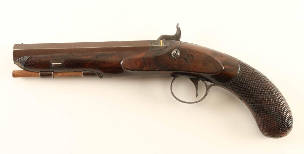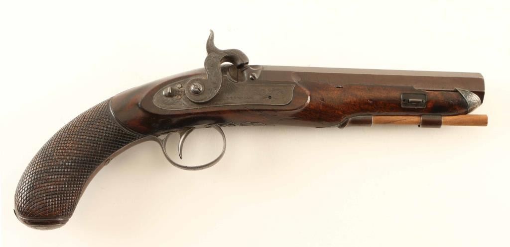 High quality muzzle loading percussion pistol with an approximate .58 caliber smooth bore, finely crafted by London gun maker Benjamin Sturman circa 1835-1867. Features fine floral scroll engraving with fish motif on the hammer, browned 6" heavy octagon barrel with damascus twist pattern & inlayed gold band, bead front sight, fixed rear sight with square notch, rounded trigger, knurled hammer spur, wood ram rod, iron furniture and figured wood stock with "WB' inscribed inlayed escutcheon, hand cut checkering, and German silver forend/grip caps. The lock is engraved "B. STURMAN", the top of the barrel is inscribed "LONDON" and bottom of the barrel is stamped with the London proof marks "[Crown]/GP" & "[Crown]/V". The barrel retains the majority of it's browned finish, the engraving remains sharp and traces of original bluing can be found in protected areas. Action is sound, the bore appears clear and the wood stock is good with blemishes, a couple losses & a missing barrel wedge escutcheon. Condition is NRA Very Good. ***Antique Firearm***