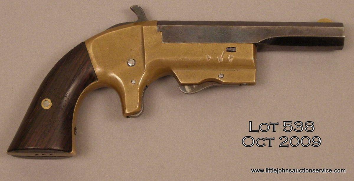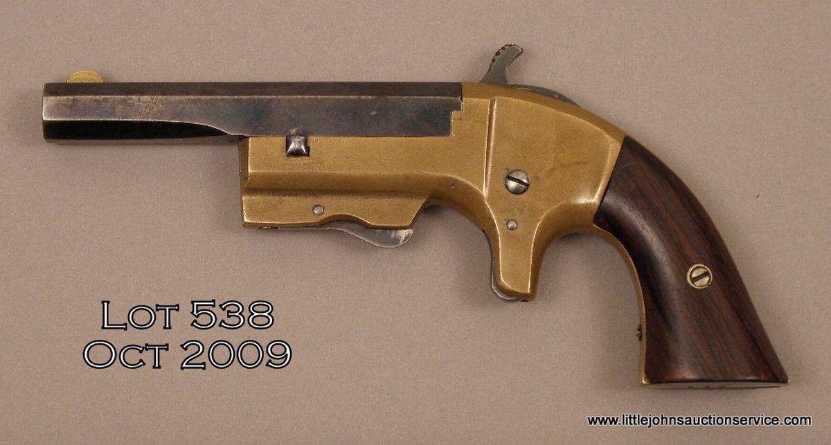 L. B. Taylor and Co. single shot derringer, .30 cal., 3-1/2” octagon barrel, brass frame, blue finish on barrel, wood grips, #976. This gun is in overall very good to excellent condition showing approx. 80% original blue finish on barrel with high point wear and a couple small spots of erosion; taffy colored brass frame, good bore, unique sliding forward barrel release, crisp action, sharp markings, very good rosewood grips. A rare derringer that was made circa 1868. Est.: $750-$1,500.