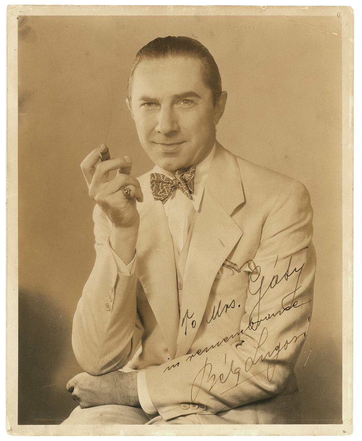 Vintage sepia 8 x 10 cardstock photo of Lugosi in a white suit smoking a cigar, signed and inscribed in black fountain pen, “To Mrs. Gaty, in remembrance, Bela Lugosi.” Mrs. Gaty was Lugosi’s neighbor in Hollywood Hills and a fellow Hungarian. In very good condition, with surface creases mainly at the edges and corners, a tack hole at each corner, and a few tiny edge chips. An excellent and uncommon portrait. Pre-certified PSA/DNA and RRAuction COA.