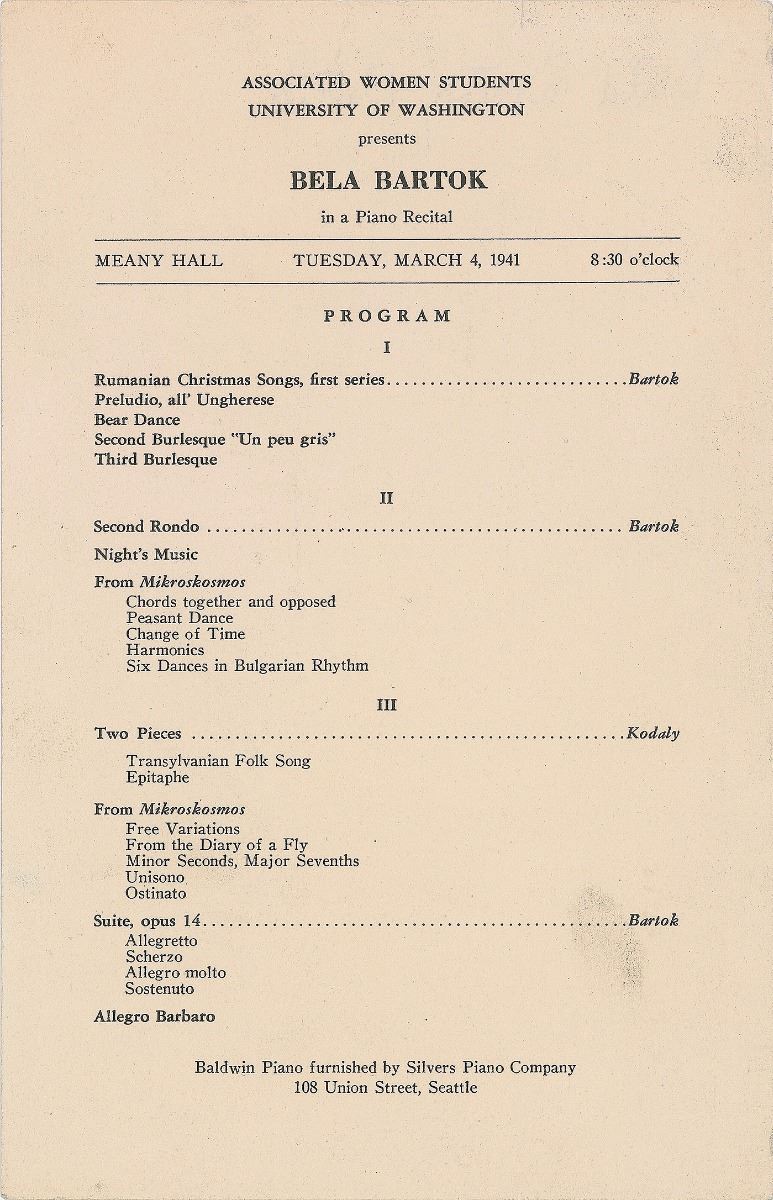 DS, one page, 8.5 x 11, August 27, 1941. Bartok agrees to extend his contract and confirms it “has been transferred with all its benefits and obligations to the Boosey & Hawkes Artists Bureau.” It also specifies that “the activities of Mrs. Bela Bartok under the same terms and conditions, should not be continued.” Boldly signed at the conclusion in fountain pen by Bartok and countersigned by an agency representative. In fine condition. Accompanied by a program for a performance signed on the reverse in pencil by his wife, Ditta Pasztory-Bartok.