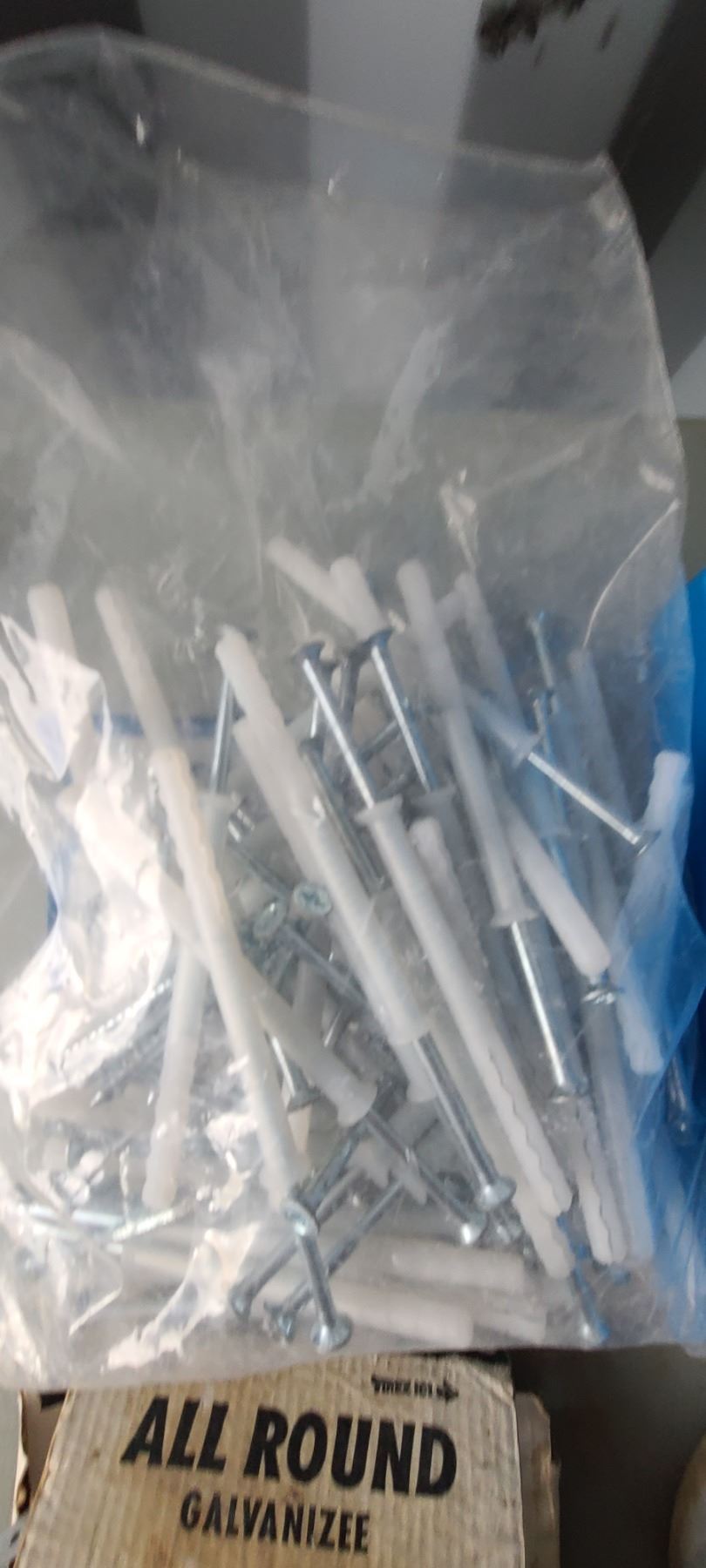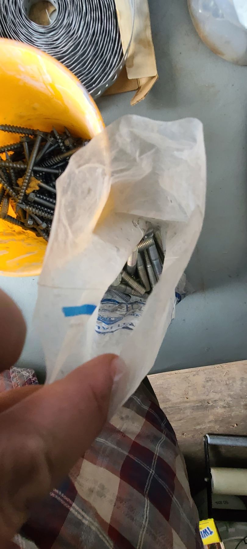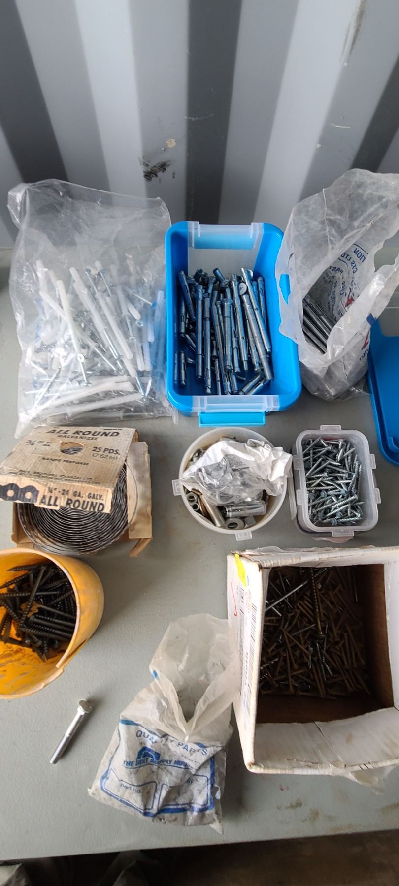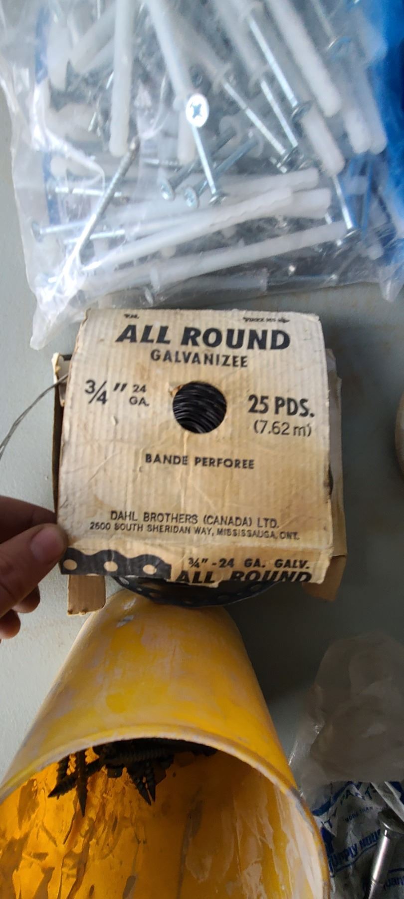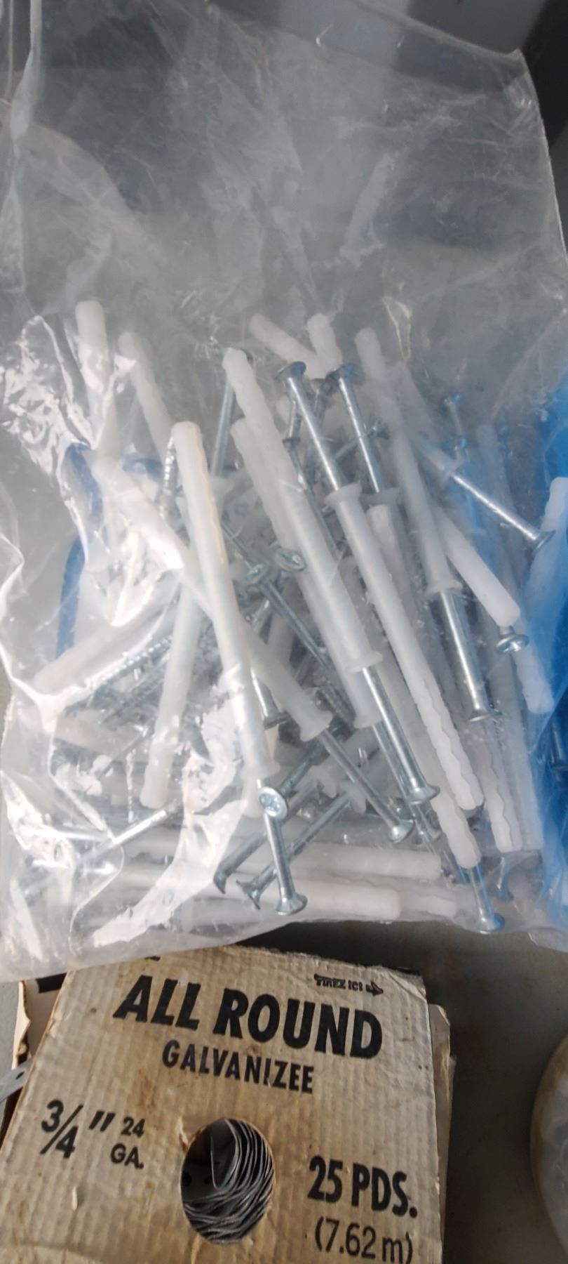 BAAG OF DRYWALL SPACER SCREWS, CONCERETE ANCHOR BOLTS, WIRE STRAPPING AND MISC.