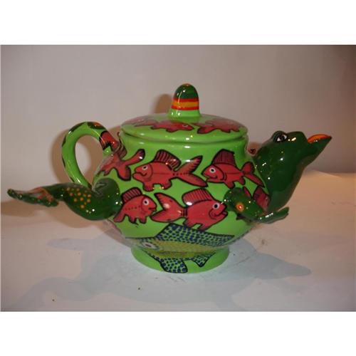 Ceramic Frog Teapot; 2006: Modeled with extended arms and head, and painted with fish and octopi. Signed “Baba Wague Diakite” (?) and dated underfoot.