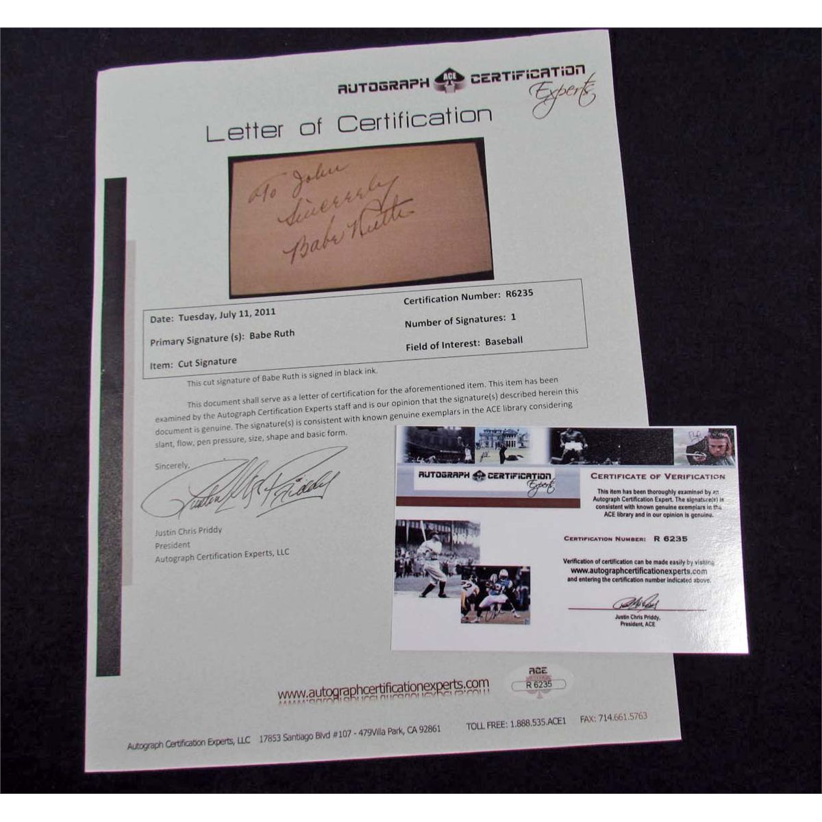 This is a cut signature of Babe Ruth signed in black ink. The COA is from ACE Autograph Certification.