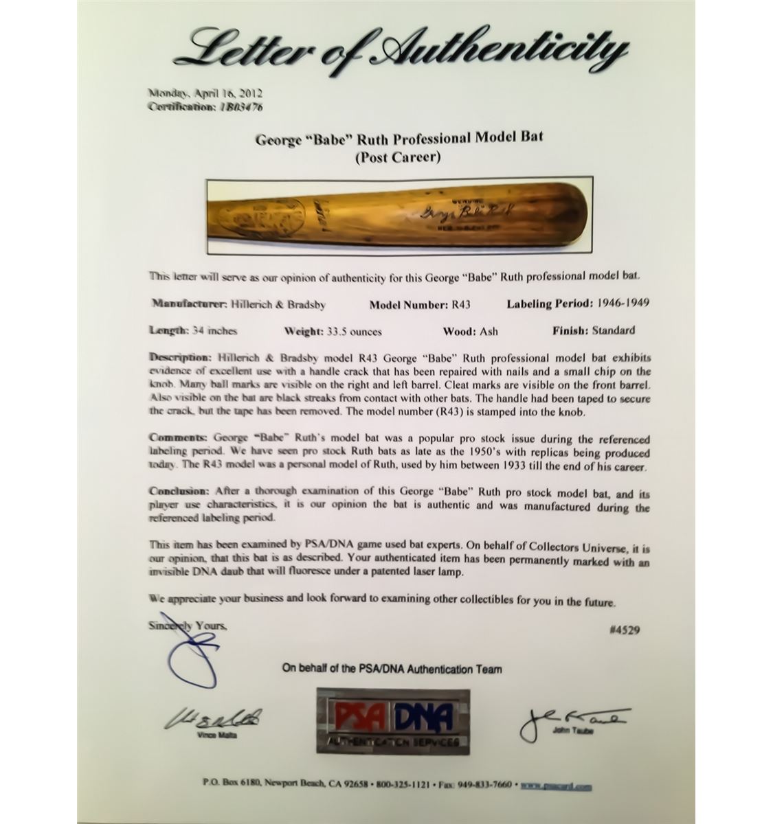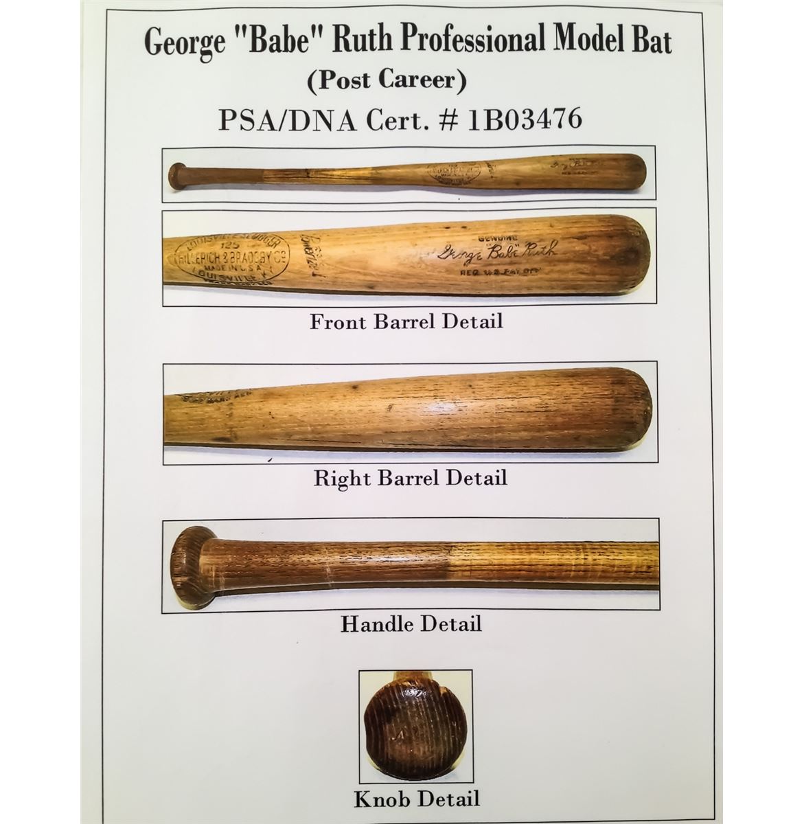 A George "Babe" Ruth professional model baseball bat. The bat was manufactured after Ruth retired from the Majors however he did coach and play in exhibition games after his retirement so there is a chance this bat was used by Ruth. More information about the bat is detailed on the included PSA/DNA certificate shown in the lot photos.