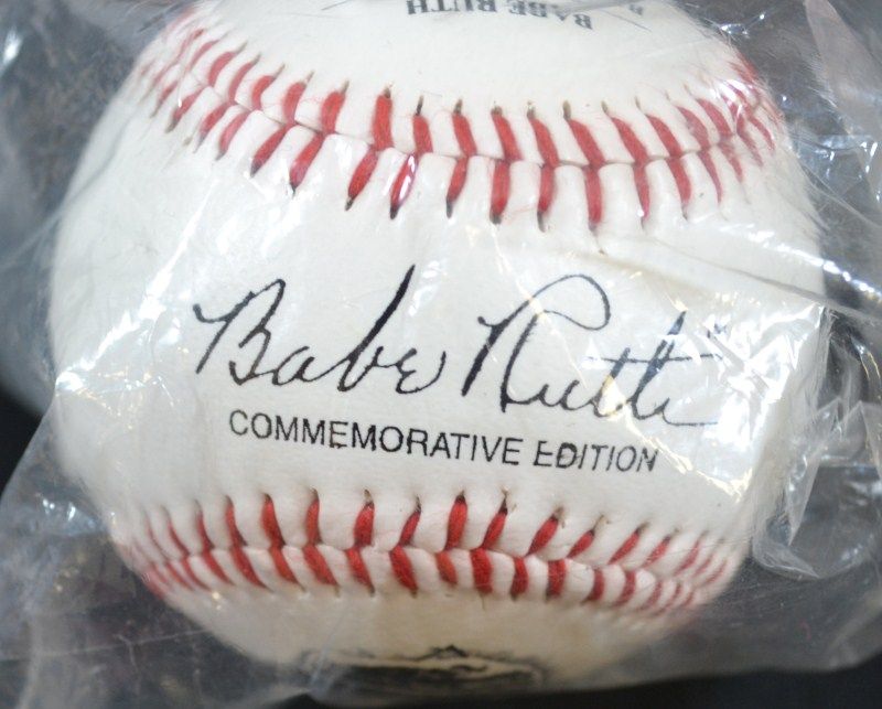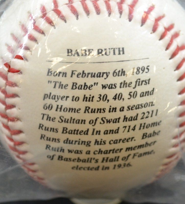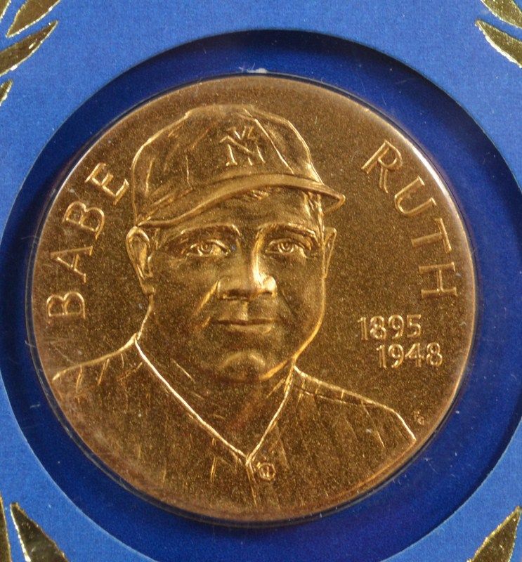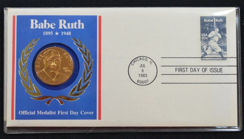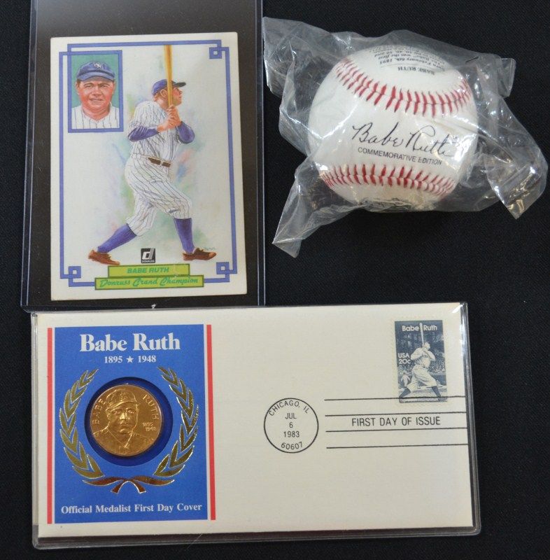 RECEIVE COMMEMORATIVE RUTH BALL, 1st DAY COVER ENVELOPE WITH COMMEM STAMP & MEDAL, DONRUSS 3x5 CARD VG, EST $25- $30