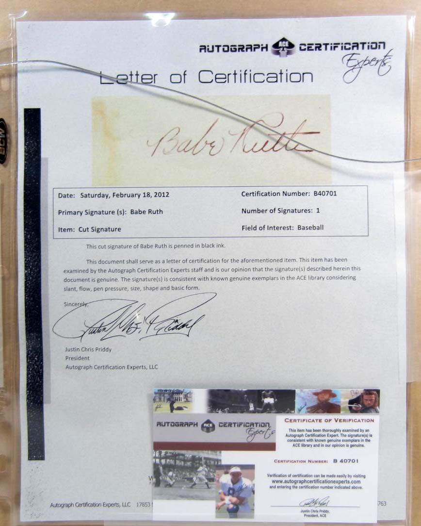 Old Gold Cigarette Advertising Print w/ cut signature by Babe Ruth penned in black ink. COA from Ace Autograph Certification. Approx. 15.5" by 15"