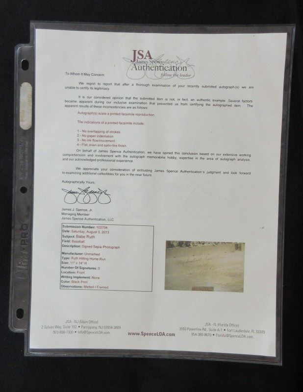 Babe Ruth on 11 x 14 Sepia Photograph, Manufacturer Unmarked, Matted Framed, JSA CERT, EST $150-$200