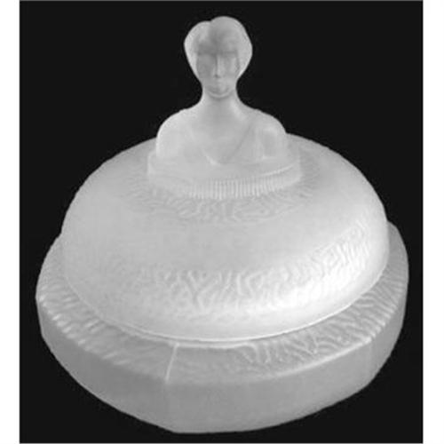 This female figural powder jar has a striking Art Deco design featuring the head and shoulders of a young lady flapper with bobbed hair on its lid. This powder jar, known as BABS II, is shown on pg 29 of Whitmyer - Bedroom & Bathroom Glassware of the Depression Years. Beautifully executed with fine definition to her features. Measuring about 4 1/2 inches tall x 4 inches across and produced, circa 1930, in lovely satin glass, with both the jar and lid in excellent condition.