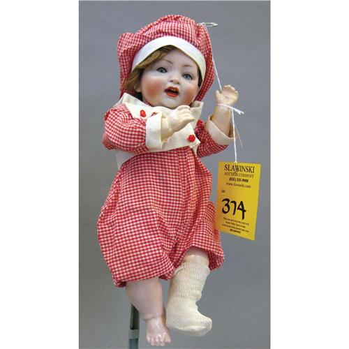 BABY BISQUE HEAD DOLL with red outfit length: 13"