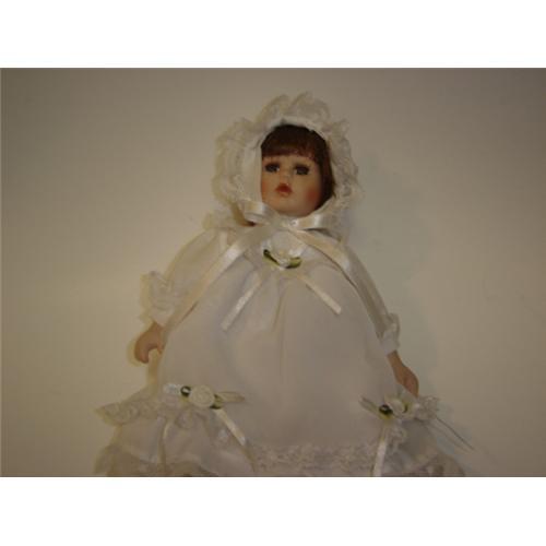 SHE IS ONLY 8 INCHES TALL. LIGHT BROWN HAIR. WHITE LACE DRESS.