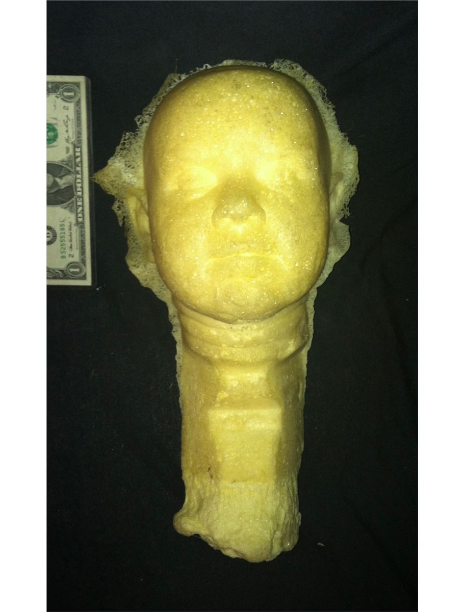 This is a poly foam casting of a baby head with neck. Excellent to finish up yourself or for use in your Haunt.