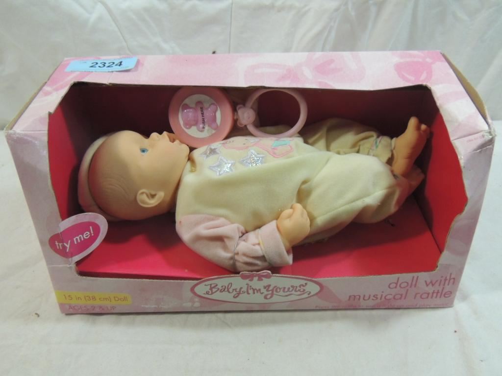 BABY IM YOURS DOLL WITH MUSICAL RATTLE 15IN DOLL, NEW IN BOX BABY DOLL AS SHOWN SEE PHOTO FOR MORE DETAILS.