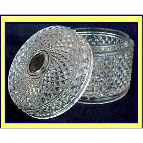 Mint Baccarat cut glass box with lid or jar. Made in France, late 19th - early 20th century.<BR>Measures 3 1/2inches high; 3 3/8inches in diameter.<BR>Round box, the entire surface covered in deeply cut glass in diamond pattern. The lid echoes this pattern, with size of diamonds increasingly small as they approach the center. Starburst radiates accross the underside.<BR>Box is signed BACCARAT in raised letters on the bottom.<BR>Condition is good. No damage of any sort.