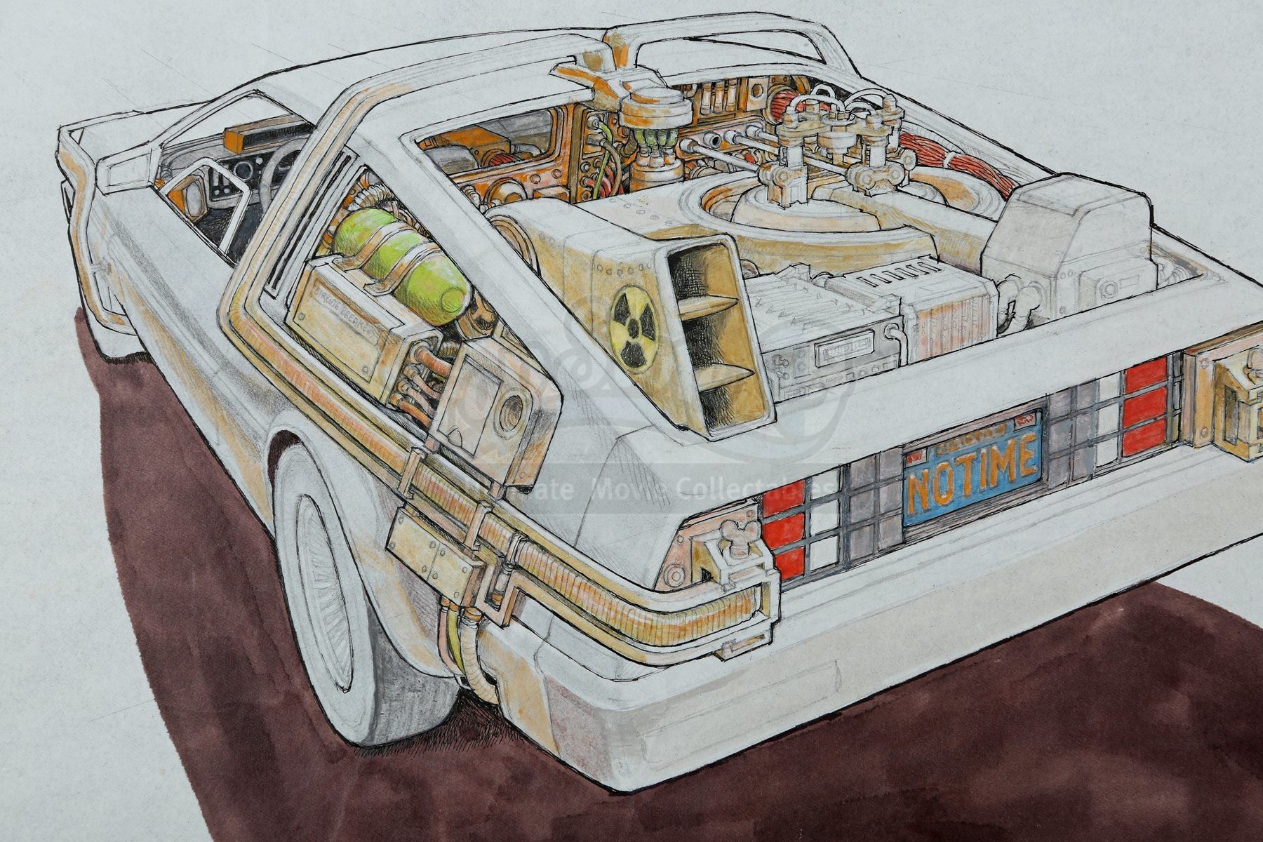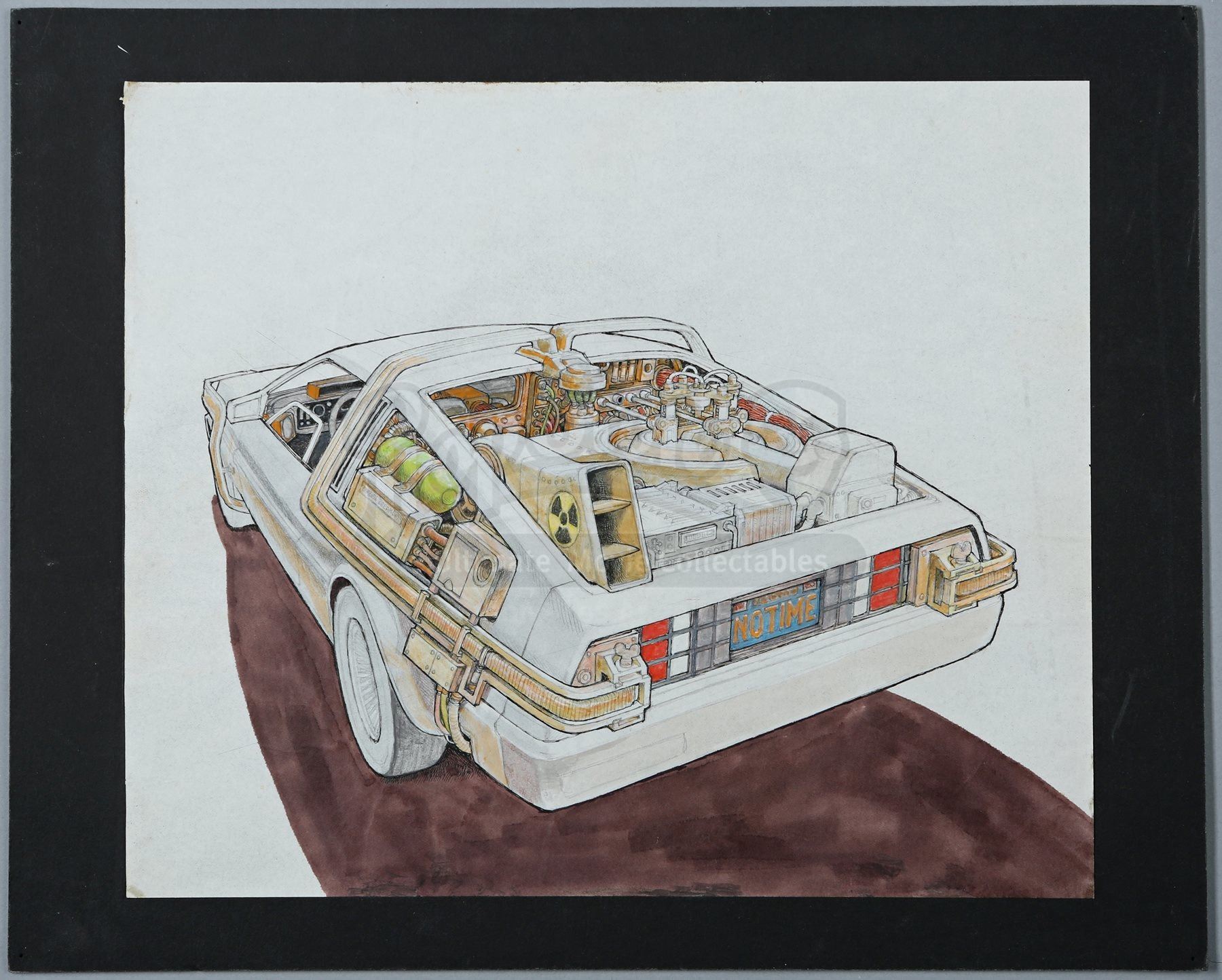 Hand-drawn artwork depicting the exterior of the DeLorean time machine from Robert Zemeckis’ time-travel adventure Back to the Future. Rendered by Ron Cobb, the illustration is one of the earliest designs for Doc Brown’s (Christopher Lloyd) stylish time machine.