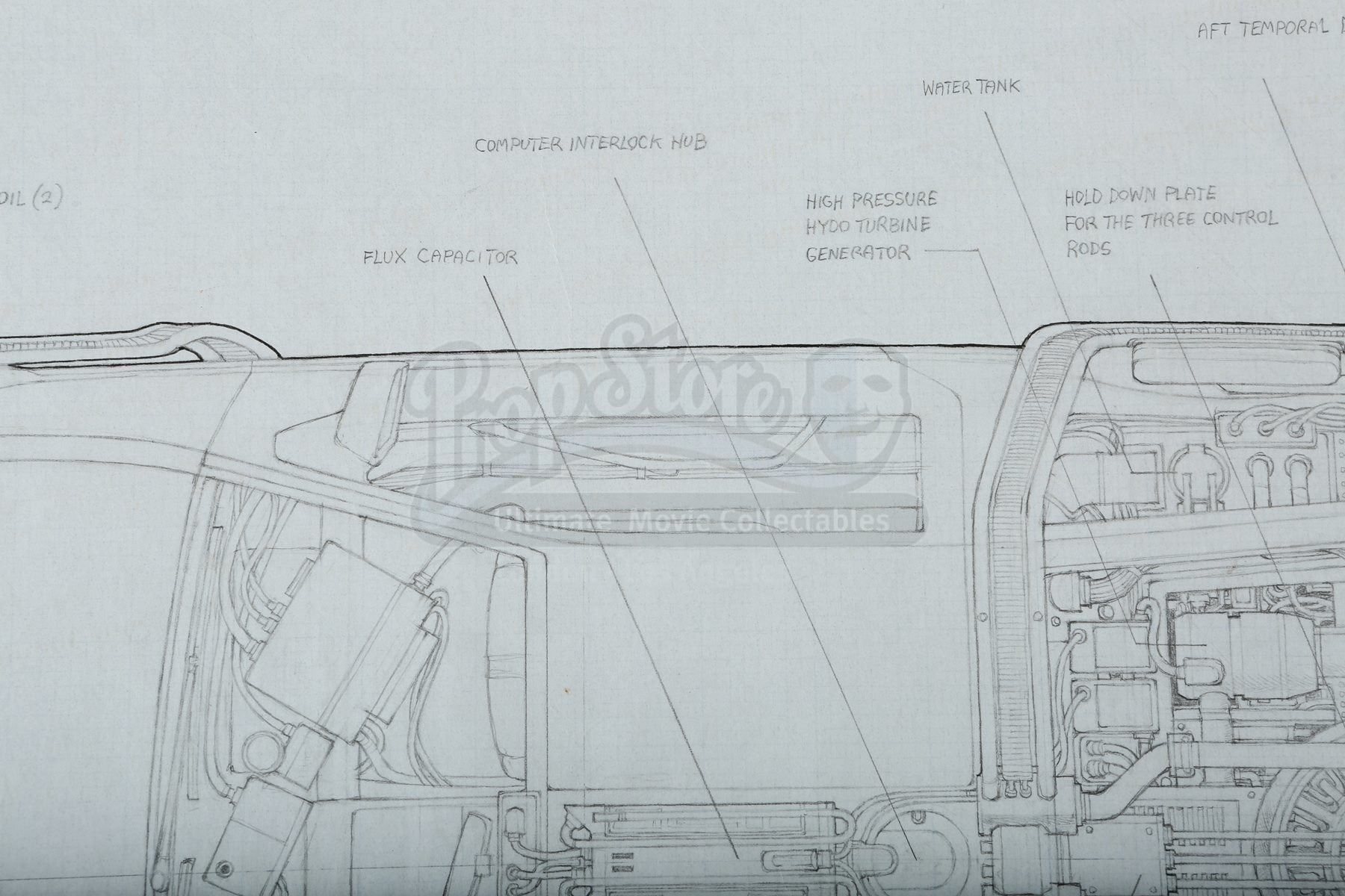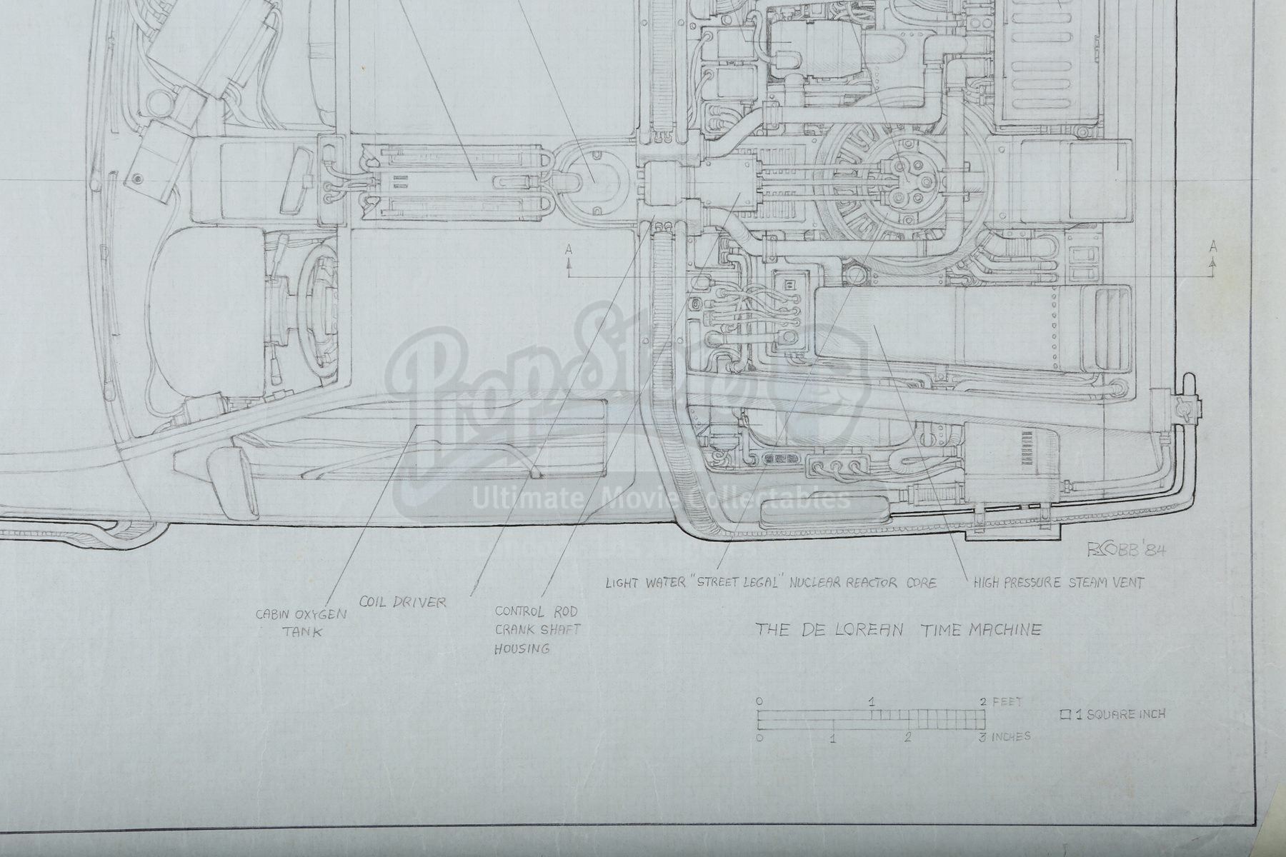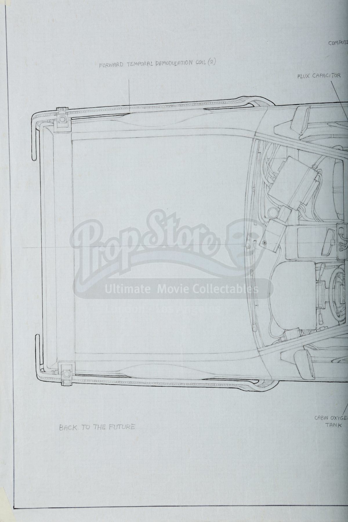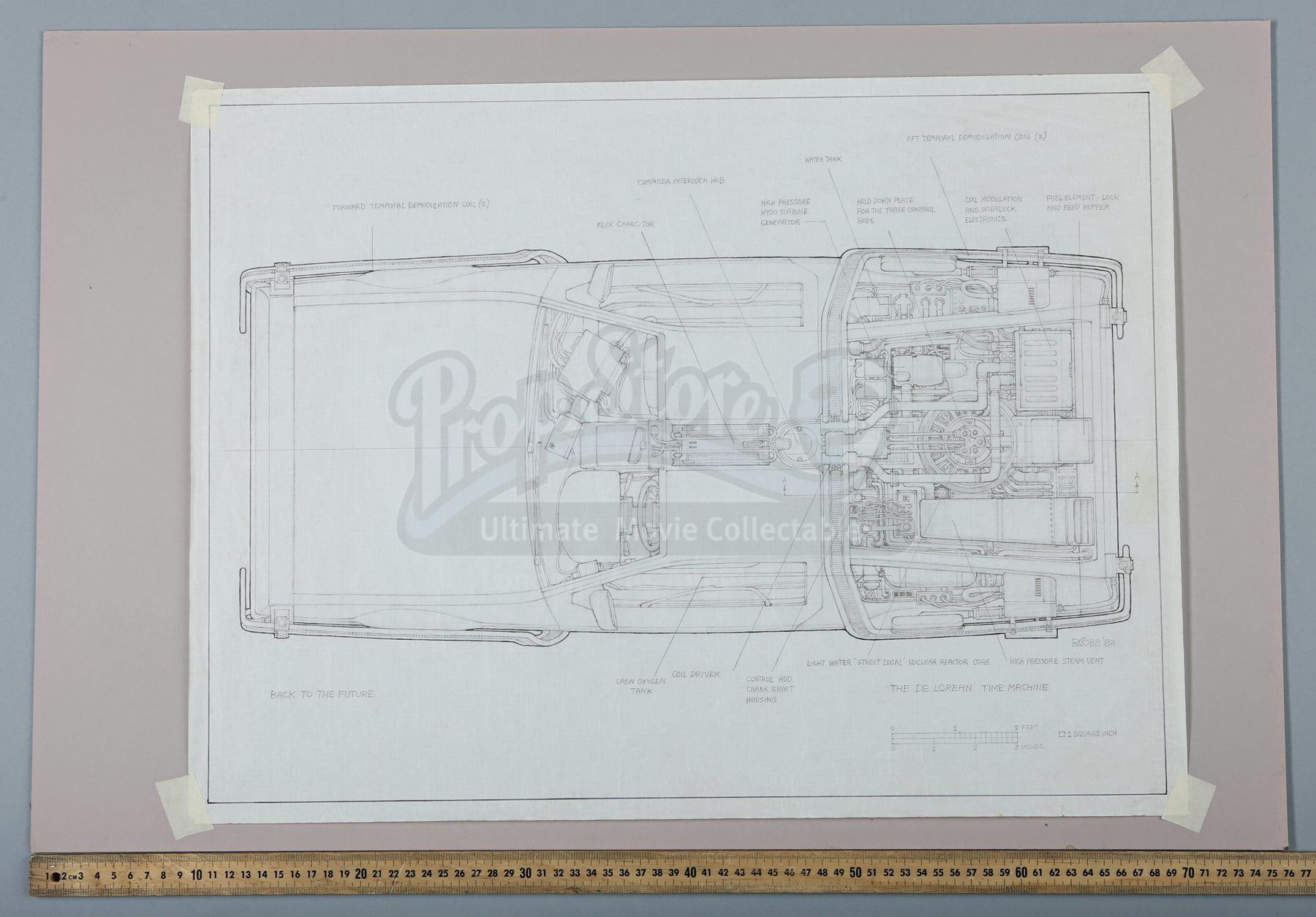 Hand-drawn artwork depicting an overhead plan of the DeLorean time machine from Robert Zemeckis’ time-travel adventure Back to the Future. Rendered by Ron Cobb — a production designer who helped design the time machine in a special consultant role — this illustration is one of the earliest designs for Doc Brown’s (Christopher Lloyd) stylish invention.