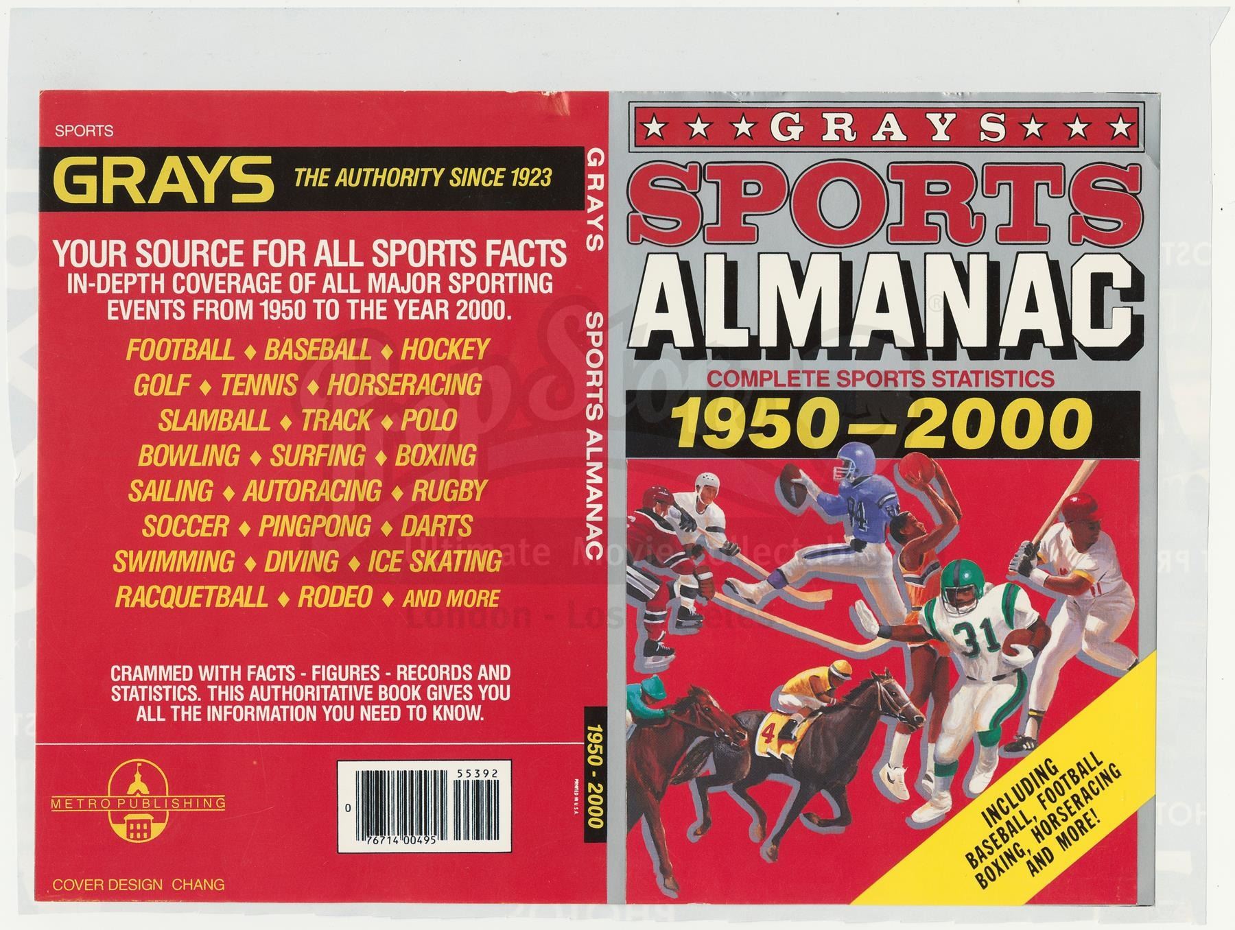 A Grays Sports Almanac cover from Robert Zemeckis' sci-fi adventure sequel Back to the Future Part II. Marty McFly (Michael J. Fox) saw a copy of Grays Sports Almanac in an antique store window while in the year 2015.