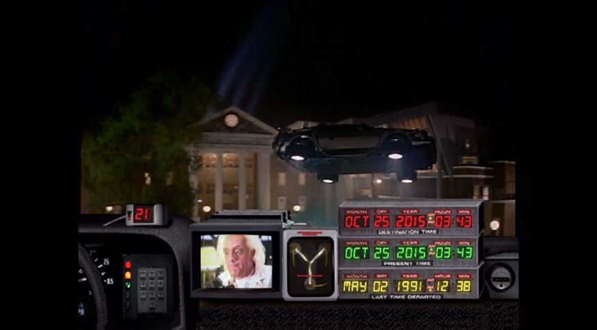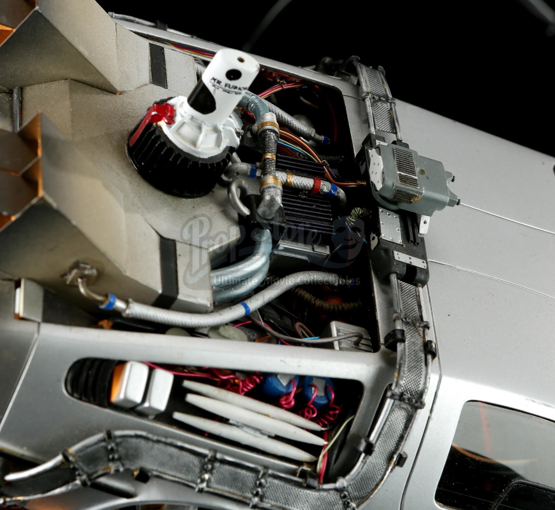 The DeLorean time machine model is entirely custom-made for the simulator attraction film, featuring a plastic body that has been fully dressed to match the time machine in the films, with the tyres in a horizontal flying position. It features all of the dressing that made the time machine famous, such as the large rear vents, 'Mr. Fusion' and 'OUTATIME' license plate. The model was hung from a marionette-style rig using nine small wires, and was puppeteered using a motion control rig. It was used extensively for filming the Hill Valley and prehistoric scenes.